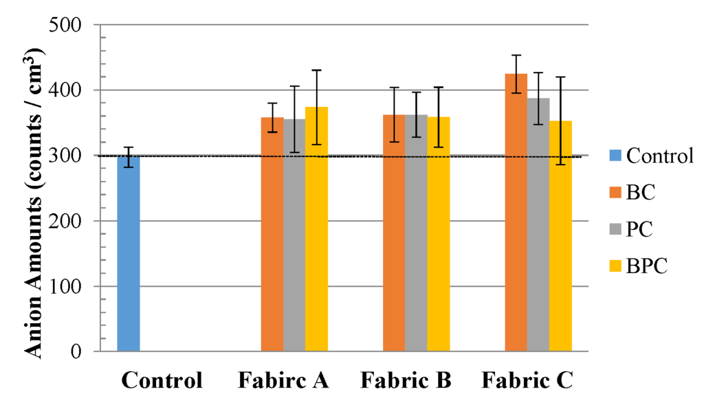 Anion amounts of elastic warp-knitted fabrics (Fabrics A, B, and C) made by BC, PC and BPC ring-spun complex yarns.