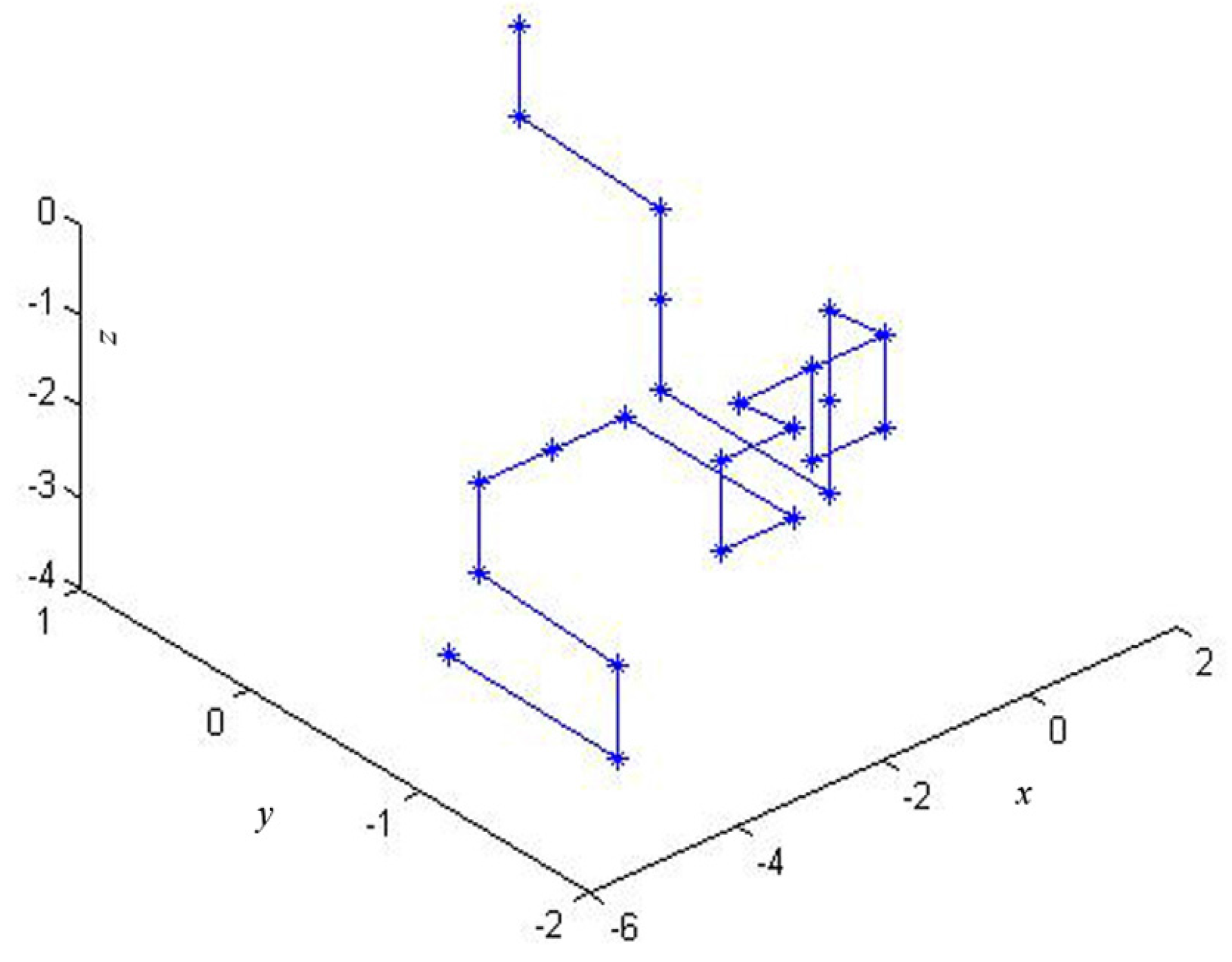 To obtain the spatial curve of a DNA sequence, we move a unit length in the direction that the above assignment dictates. Taking sequence segment ATGGTGCACCTGACTCCTGATCTGGTA as an example, we inspect it by stepping two nucleotides at a time. Starting from the origin , we move in the direction dictated by the first dinucleotide AT, , and arrive at , the first point of the 3-D curve. From this point, we move in the direction dictated by the second dinucleotide TG, , and arrive at the second point . From here we move in the direction dictated by the third dinucleotide GG, , and come to the third point . Continuation of this process is illustrated in Table 2, and the corresponding 3-D graphical representation is shown in Figure 1.