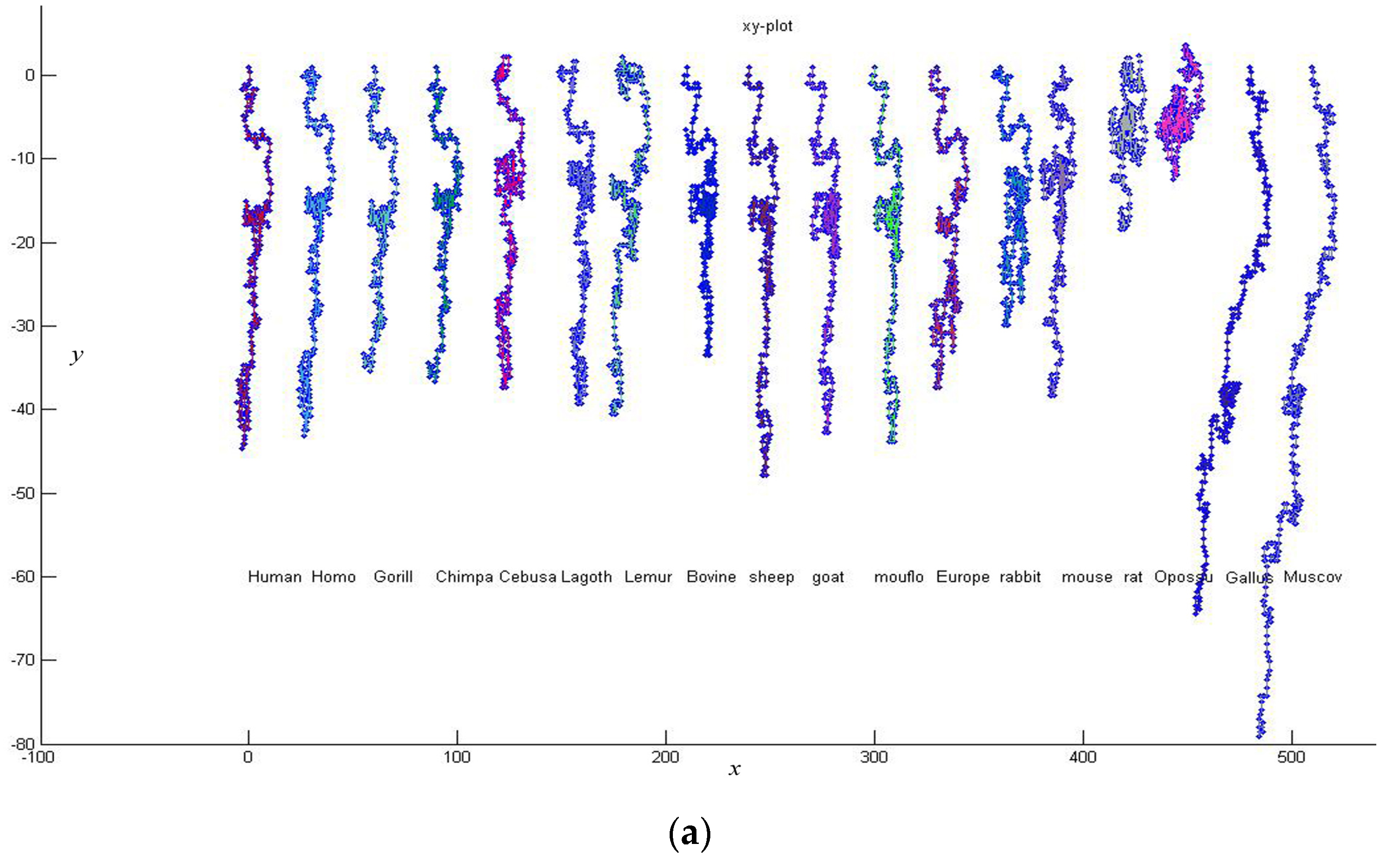- Leong, P.M.; Morgenthaler, S. Random walk and gap plots of DNA sequences. Comput. Appl. Biosci. 1995, 11, 503–507. [Google Scholar] [CrossRef] [PubMed]