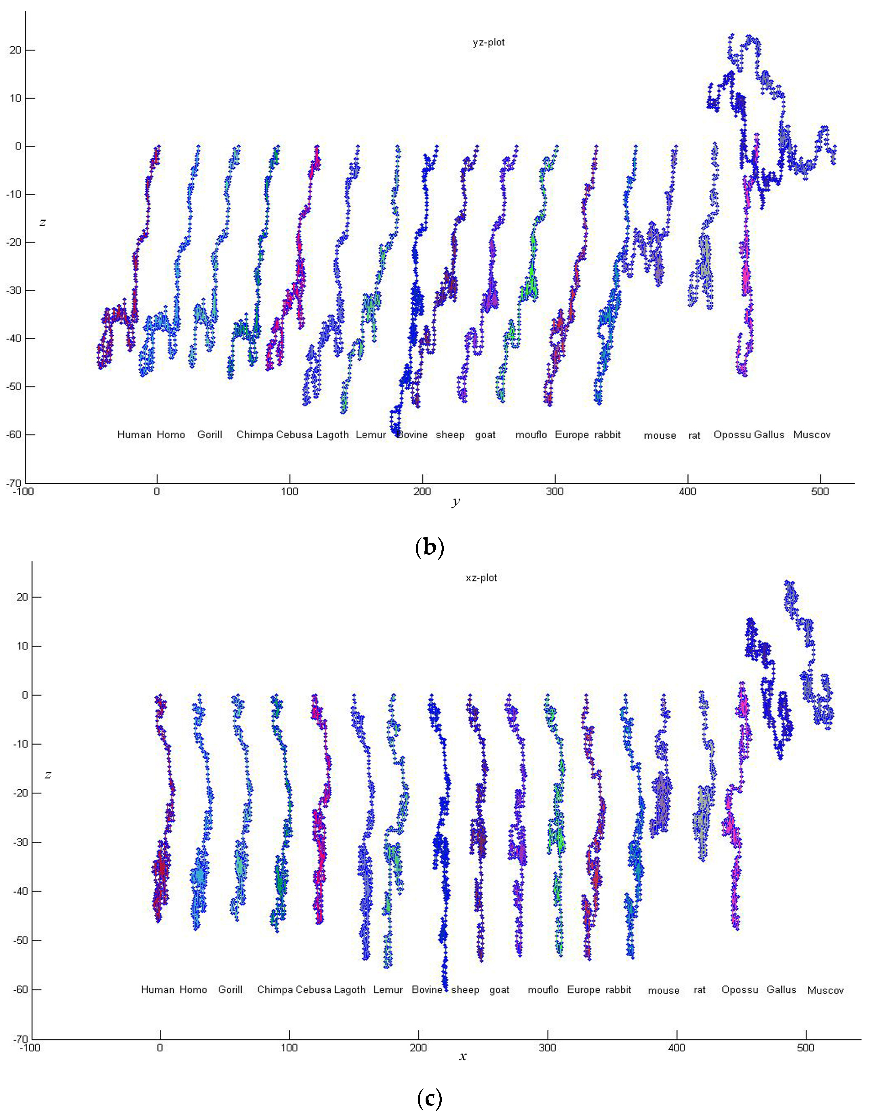 It is easy to see that, in each projection, the trend of curves of the two non-mammals (Gallus, Muscovy duck) is distinguished from that of the mammals. On the other hand, the Primates species are similar to one another, so it is with the curves of bovine, sheep, goat, and mouflon. Also, the curves of rabbit and European hare show their great similarity. In addition, both Figure 2b, the projection on yz-plane, and Figure 2c, the projection on xz-plane, show opossum has relatively low similarity with the remaining mammals, while mouse and rat look similar to each other because both of their curves wind themselves into a mass and need a relatively small space.