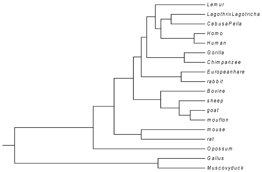Firstly, we give a comparison for CDS (Coding DNA Sequence) of β-globin gene of 18 species listed in Table 3. The lengths of the 18 sequences are about 434 bp. Thus K is taken to be 4, and each of these sequences is converted into a 12-D vector. According to Equation (7), we calculate the distance between any two of the 18 DNA sequences. Then an real symmetric matrix is obtained. On the basis of , a phylogenetic tree (see Figure 3) is constructed using UPGMA (Unweighted Pair Group Method with Arithmetic Mean) program included in MEGA4 []. Observing Figure 3, we find that the CDS are more similar for Primate group {Gorilla, Chimpanzee, Human, Homo, CebusaPella, LagothrixLagotricha, Lemur}, Cetartiodactyla group {bovine, sheep, goat, mouflon}, Lagomorpha group {Rabbit, European hare}, and Rodentia group {mouse, rat}, respectively. On the other hand, CDS of the two kinds of non-mammals {Gallus, Muscovy duck} are very dissimilar to the mammals because they are grouped into an independent branch. This is analogous to that reported in the literature [,,,], and the relationship of these species detected by their graphical representations as well. From this result, a conclusion one can draw is that the cell-based descriptors of the new graphical representation may suffice to characterize DNA sequences.