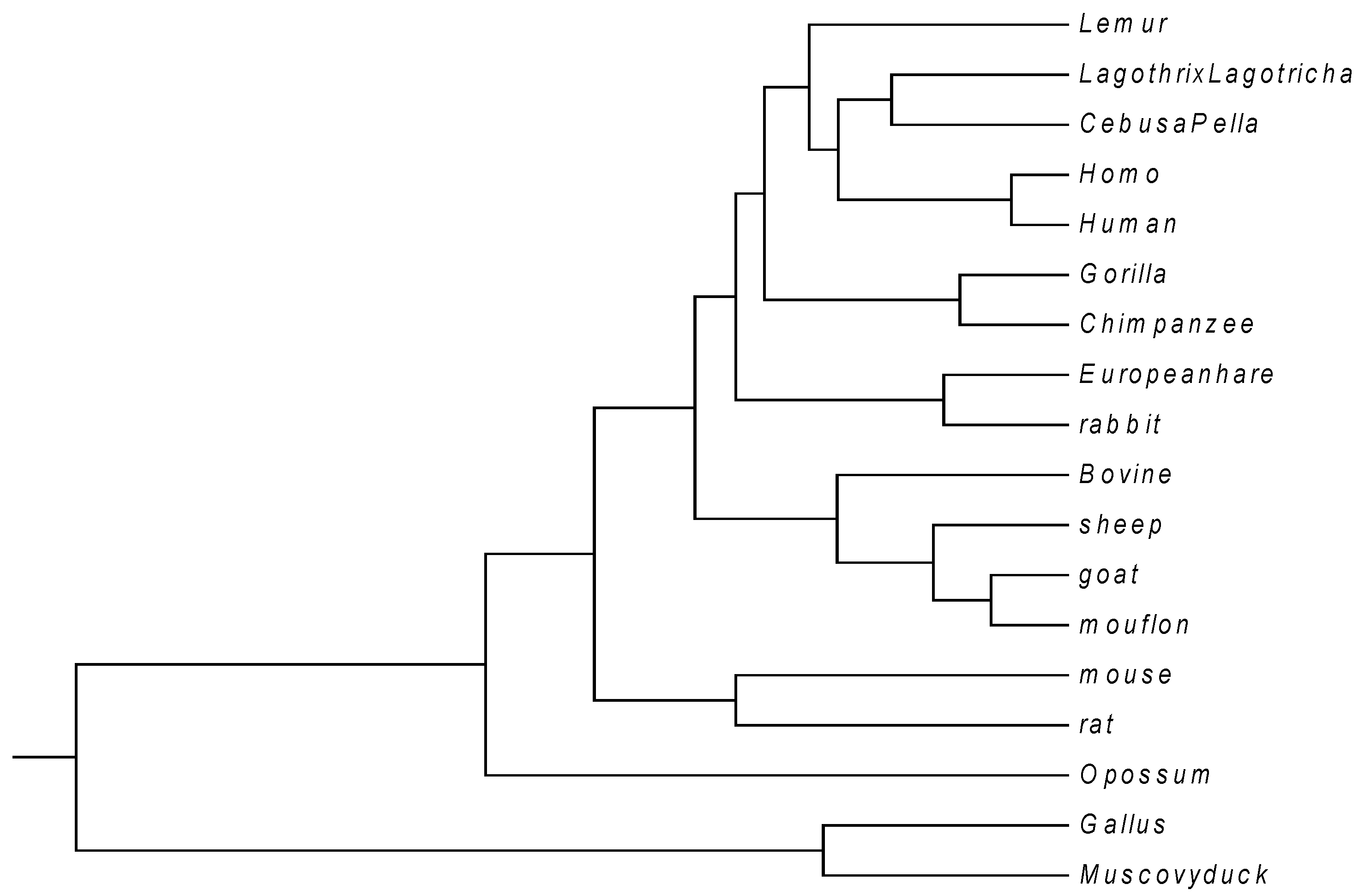 Firstly, we give a comparison for CDS (Coding DNA Sequence) of β-globin gene of 18 species listed in Table 3. The lengths of the 18 sequences are about 434 bp. Thus K is taken to be 4, and each of these sequences is converted into a 12-D vector. According to Equation (7), we calculate the distance between any two of the 18 DNA sequences. Then an real symmetric matrix is obtained. On the basis of , a phylogenetic tree (see Figure 3) is constructed using UPGMA (Unweighted Pair Group Method with Arithmetic Mean) program included in MEGA4 [34]. Observing Figure 3, we find that the CDS are more similar for Primate group {Gorilla, Chimpanzee, Human, Homo, CebusaPella, LagothrixLagotricha, Lemur}, Cetartiodactyla group {bovine, sheep, goat, mouflon}, Lagomorpha group {Rabbit, European hare}, and Rodentia group {mouse, rat}, respectively. On the other hand, CDS of the two kinds of non-mammals {Gallus, Muscovy duck} are very dissimilar to the mammals because they are grouped into an independent branch. This is analogous to that reported in the literature [8,12,14,31], and the relationship of these species detected by their graphical representations as well. From this result, a conclusion one can draw is that the cell-based descriptors of the new graphical representation may suffice to characterize DNA sequences.