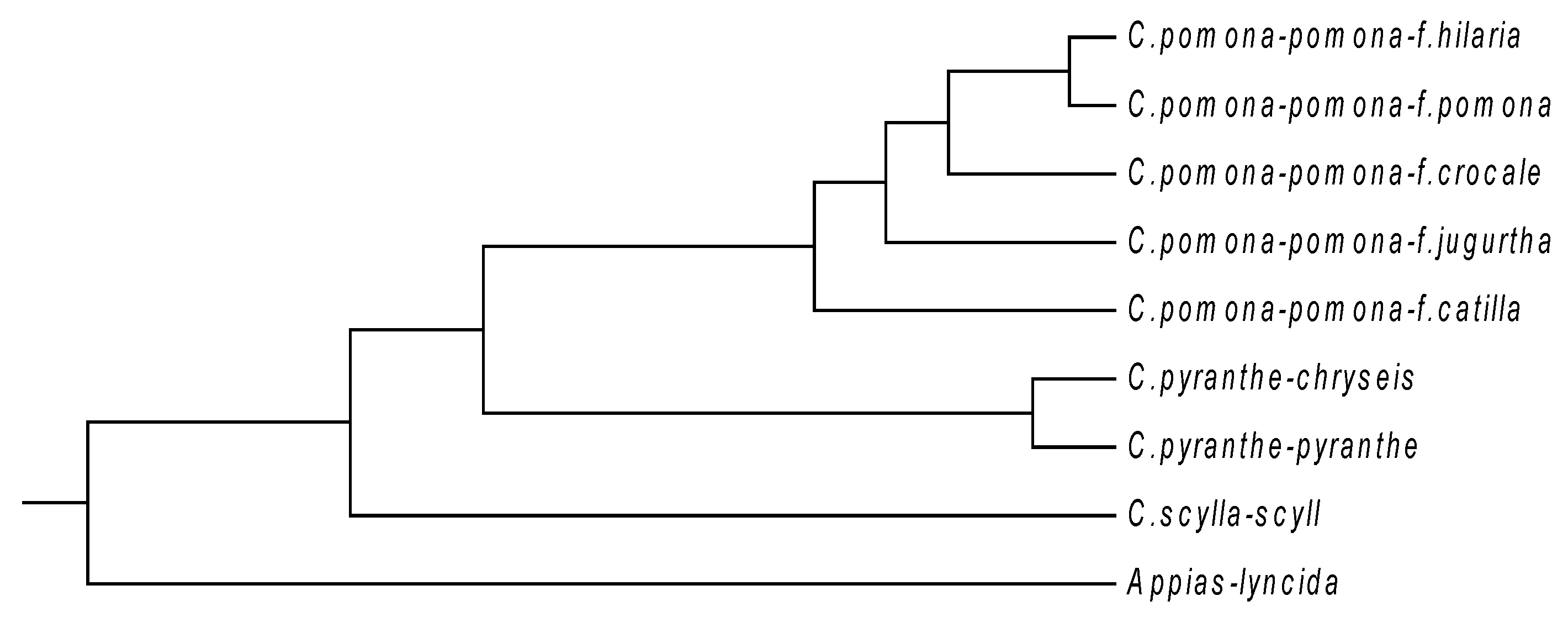 - Wang, J.; Shang, S.Q.; Zhang, Y.L. Phylogenetic relationship of genus catopsilia (Lepidoptera: Pieridae) based on partial sequences of NDI and COI genes from China. Acta. Zootaxon. Sin. 2010, 35, 776–781. [Google Scholar]