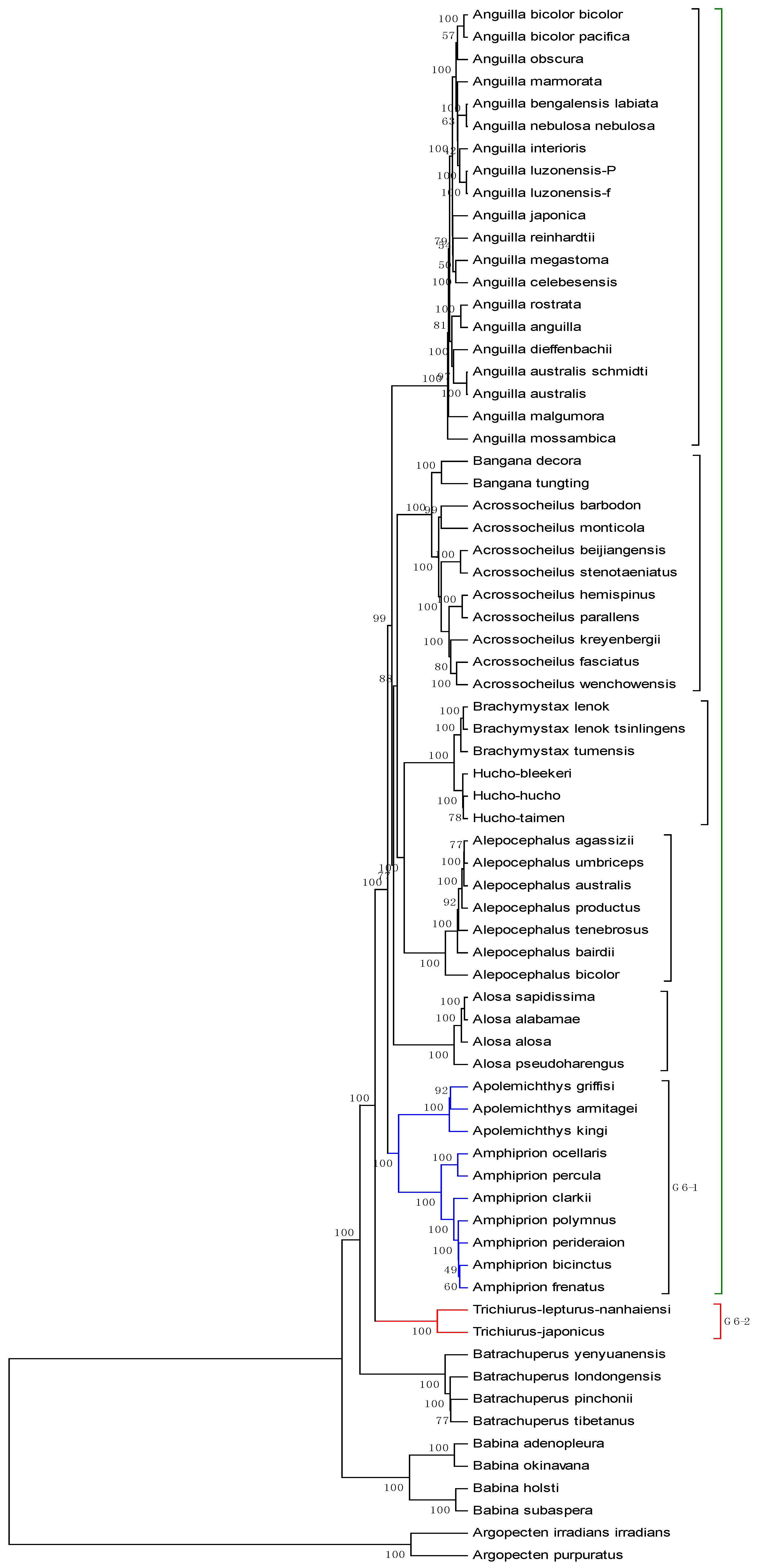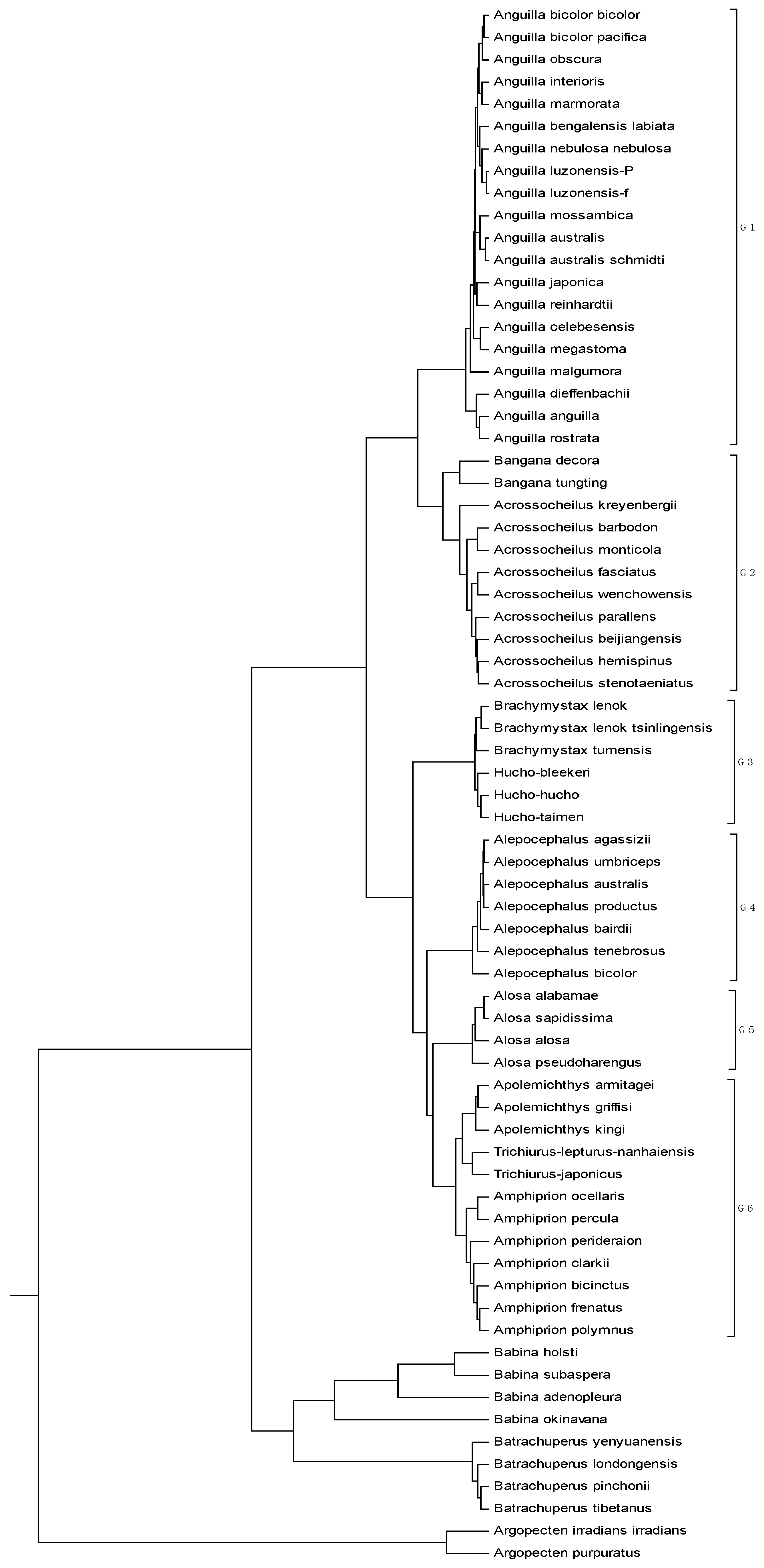 The mitogenome dataset comprises 70 complete mitochondrial genomes of Eukaryota. The name, accession number, and genome length are listed in Table 6. Among them, two species (Argopecten irradians irradians and Argopecten purpuratus) belong to family Pectinidae are used as the out-group. Four species belong to the Order Caudata under the Class Amphibia, while four species belong to the Order Anura under the same Class. The remaining belongs to the Class Actinopterygii. The average length of the 70 genome sequences is about 16817 bp. Thus, K is calculated as 6, and each of these genome sequences is converted into an 18-D vector. The phylogenetic tree constructed by our method is shown in Figure 6. It is easy to see from Figure 6 that the two Pectinidae species stay outside of the others, while the four Hynobiidae species and four Ranidae species form an independent branch. In the subtree of the Class Actinopterygii, the 60 genomes are separated into six groups: group 1 corresponds to genus Anguilla under family Anguillidae; group 2 includes genera Bangana and Acrossocheilus under family Cyprinidae; group 3 includes genera Brachymystax and Hucho under family Salmonidae; group 4 is genus Alepocephalus under family Alepocephalidae; group 5 is the family of Clupeidae; group 6 includes genera Trichiurus, Amphiprion and Apolemichthys under Acanthomorphata. This result agrees well with the established taxonomic groups. In addition, we make a comparison for the 70 genome sequences by using ClustalX2.1 [38], and the corresponding tree is shown in Figure 7. Observing Figure 7, we find that the tree includes four branches: the outside is the Argopecten branch, the following is Babina, then Batrachuperus, and the subtree consisting of the other 60 species. A closer look at the subtree shows that Trichiurus is distinguished from the remaining, which seems to be a disappointing phenomenon in the evolutionary sense.