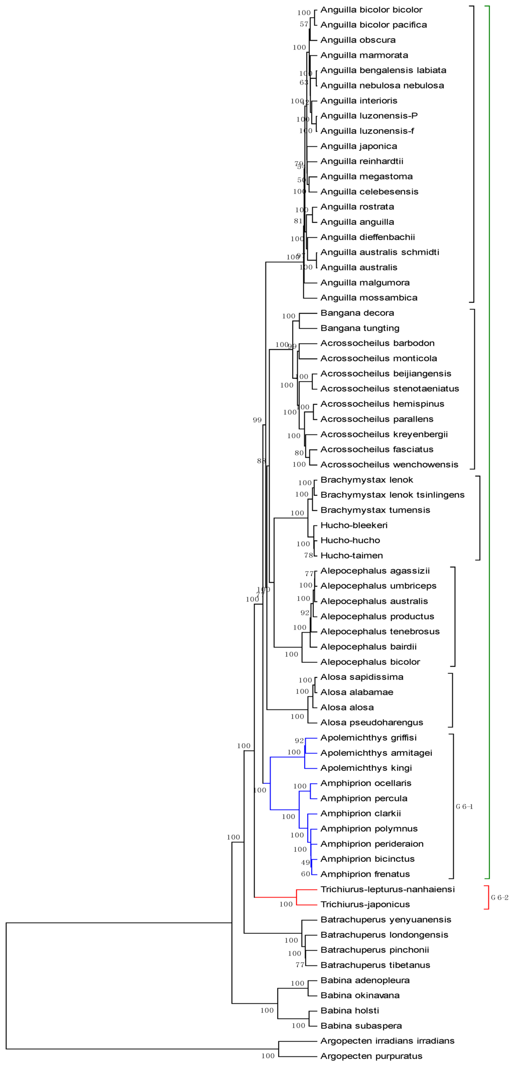 The mitogenome dataset comprises 70 complete mitochondrial genomes of Eukaryota. The name, accession number, and genome length are listed in Table 6. Among them, two species (Argopecten irradians irradians and Argopecten purpuratus) belong to family Pectinidae are used as the out-group. Four species belong to the Order Caudata under the Class Amphibia, while four species belong to the Order Anura under the same Class. The remaining belongs to the Class Actinopterygii. The average length of the 70 genome sequences is about 16817 bp. Thus, K is calculated as 6, and each of these genome sequences is converted into an 18-D vector. The phylogenetic tree constructed by our method is shown in Figure 6. It is easy to see from Figure 6 that the two Pectinidae species stay outside of the others, while the four Hynobiidae species and four Ranidae species form an independent branch. In the subtree of the Class Actinopterygii, the 60 genomes are separated into six groups: group 1 corresponds to genus Anguilla under family Anguillidae; group 2 includes genera Bangana and Acrossocheilus under family Cyprinidae; group 3 includes genera Brachymystax and Hucho under family Salmonidae; group 4 is genus Alepocephalus under family Alepocephalidae; group 5 is the family of Clupeidae; group 6 includes genera Trichiurus, Amphiprion and Apolemichthys under Acanthomorphata. This result agrees well with the established taxonomic groups. In addition, we make a comparison for the 70 genome sequences by using ClustalX2.1 [], and the corresponding tree is shown in Figure 7. Observing Figure 7, we find that the tree includes four branches: the outside is the Argopecten branch, the following is Babina, then Batrachuperus, and the subtree consisting of the other 60 species. A closer look at the subtree shows that Trichiurus is distinguished from the remaining, which seems to be a disappointing phenomenon in the evolutionary sense.