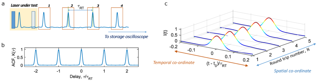 Principle of spatio-temporal dynamics—(a) Intensity dynamics (simulated) depicting evolution over multiple round trips; (b) The autocorrelation of the intensity dynamics . The periodic interval between the peaks gives the round trip time ; (c) The spatio-temporal dynamics, describing evolution of the pulse features. Horizontal co-ordinate—temporal, vertical co-ordinate—spatial.