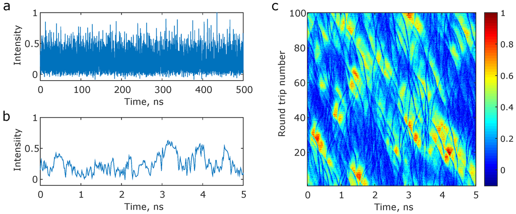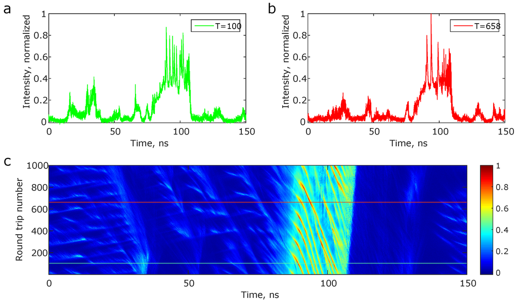 Spatio-temporal dynamics of a partially mode locked fibre laser regime—(a,b) Typical intensity dynamics observed at different time instants; and (c) the spatio-temporal dynamics of the operational regime.