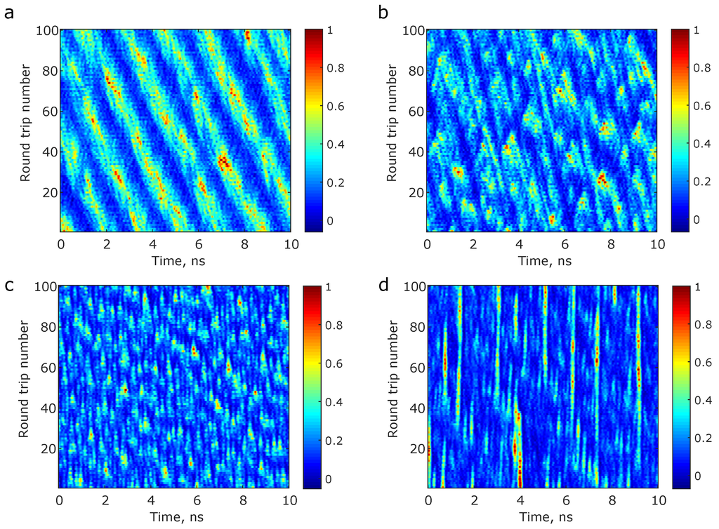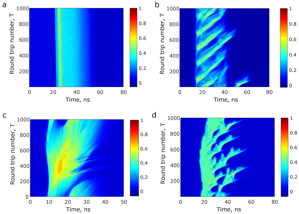 Spatio-temporal regimes of the Raman fibre laser—Spatio-temporal dynamics of a Raman fibre laser operating in the normal dispersion regimes, at different pump powers ; (a) = 1.5 W; (b) = 2.0 W; (c) = 3.0 W; and (d) = 3.25 W.