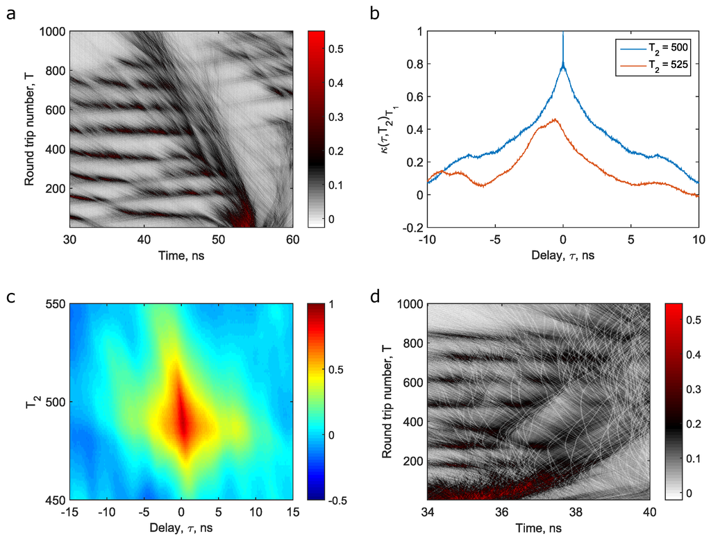 The value of can now be used to select windows of intensity dynamics occuring at round trip intervals (Figure 1c), arriving at a two dimensional representation of intensity evolution , where T now takes the notion of an evolution co-ordinate. Figure 1c then essentially presents the intensity evolution of the pulse, as observed in its rest frame, whilst it makes round trip circulations within the cavity.