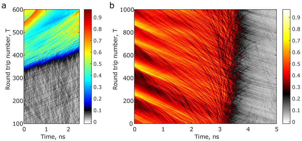 The spatio-temporal methodology offers a unique tool to identify and distinguish between the staggering diversity of operational regimes exhibited by Raman lasers [65]. For example, Figure 3 shows some of the operational regimes exhibited by a 1 km long Raman fibre laser operating in the normal dispersion in a linear cavity configuration similar as above, obtained at different pump powers. Figure 3a depicts a regime obtained for a pump power = 1.5 W. Here, the laser can be thought to be operating in a partially harmonic-mode locked regime, giving rise to a periodic train of nanosecond order pulses, with a repetition period shorter than the average round trip time. These pulses in turn are criss-crossed by dark coherent features that undergo round-trip circulations, and survive over time scales of several tens of round trips. Upon increasing the pump power to = 2.0 W, Figure 3b, the operational regime transfers to a noisy one, resulting in the generation of bright coherent features surviving over time scales of 40–50 round trips, much longer than the typical nonlinear length. Increasing the pump power to 3.0 W (Figure 3c) results in the narrowing of the above coherent features along both the temporal and spatial co-ordinates. A further increase of pump power to = 3.25 W (Figure 3d) results in a drastic transition of the operational regime to one comprising of picosecond order pulses that survive over time scales as large as 200 to 300 times the characteristic round trip time period. It is speculated that at this pump power level, the gain in the cavity becomes high enough to support the formation of parabolic pulses, and is currently being studied.