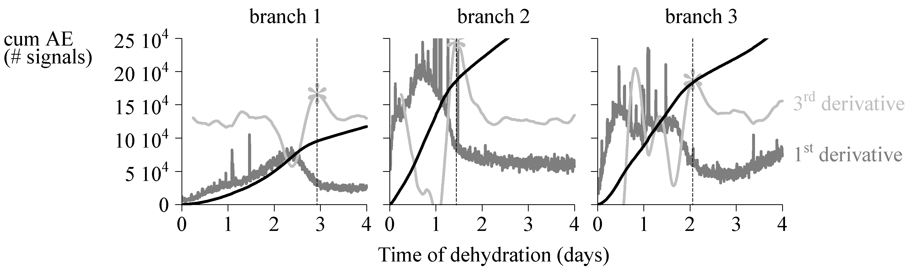 Vergeynst et al. [80] calculated the point of 100% loss of hydraulic conductivity (P100) as the endpoint of the acoustic emission (AE) activity (first derivative of the curve of cumulative AE) peak, where the third derivative of the curve of cumulative AE signals in time reached a local maximum (indicated by the vertical dashed line and the “*” symbol). The black line shows the curve of cumulative AE. Results of measurements on three different grapevine branches are shown.