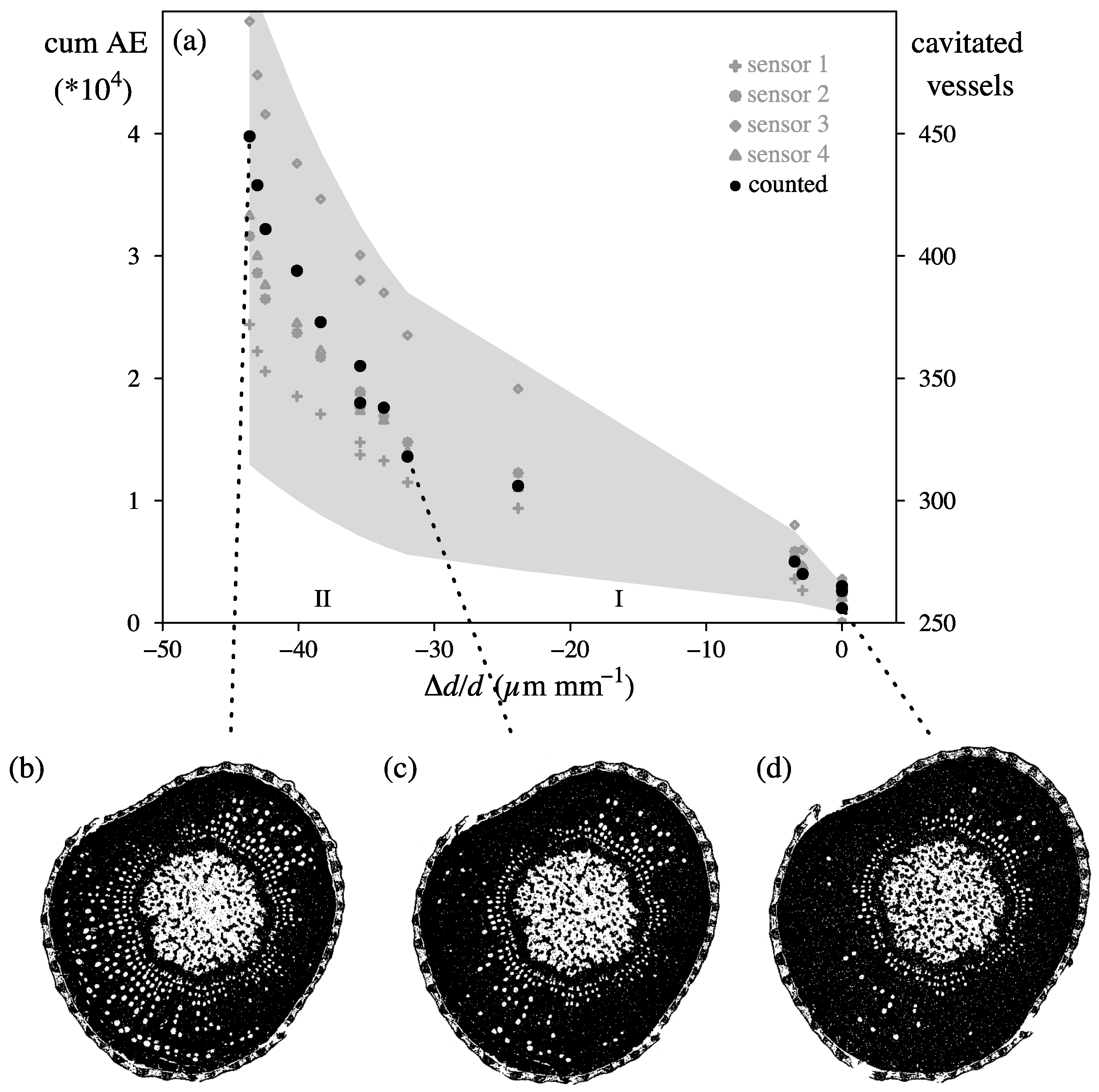 (a) Cumulative AE (cum AE, grey symbols, left y-axis) detected by four different AE sensors (1–4) showed a pattern similar to the number of cavitated vessels (black symbols, right y-axis) counted on μCT images when plotted against relative radial diameter shrinkage (∆d/d), which is a measure for decreasing xylem water potential. The μCT cross-sections of the grapevine branch are shown for the beginning (d) and end (b) of the dehydration experiment and at the breakpoint between Phases I and II (c). The grey zone in (a) delimits the 99.7% confidence interval around the mean cumulative AE curve [33].