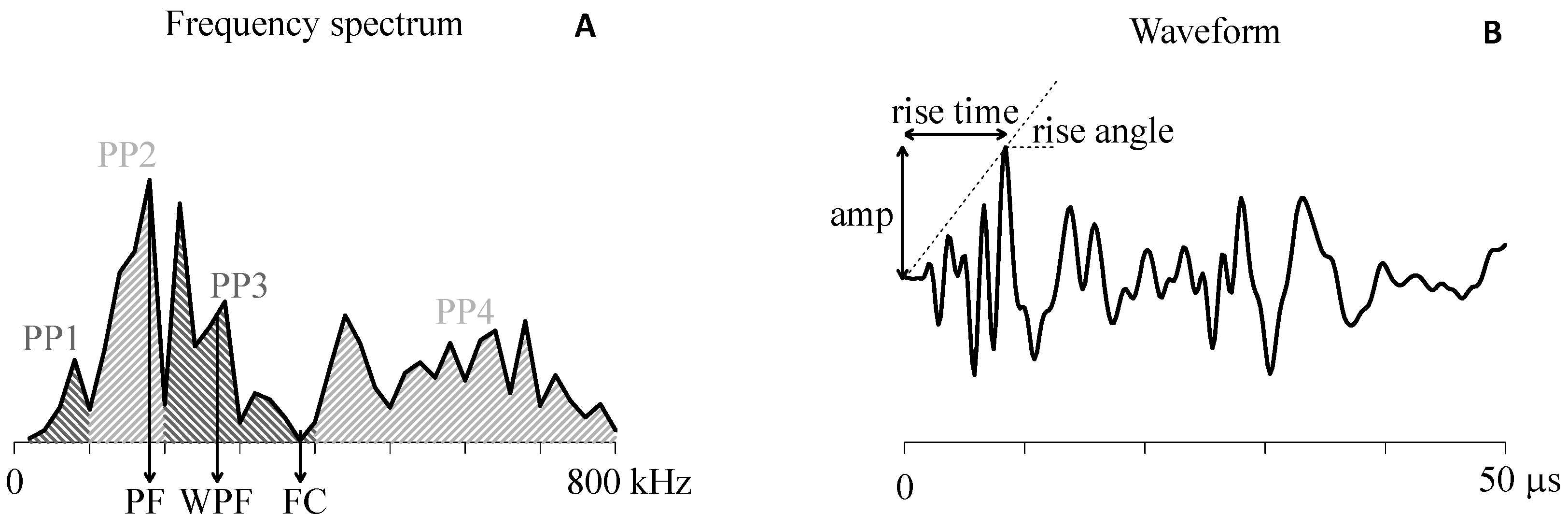 (A) Frequency features peak frequency (PF), weighted peak frequency (WPF), frequency centroid (FC) and four partial powers (PP) were used for the automated clustering algorithm; and (B) Waveform features rise time, amplitude and rise angle describe the shape of the AE signal [80].