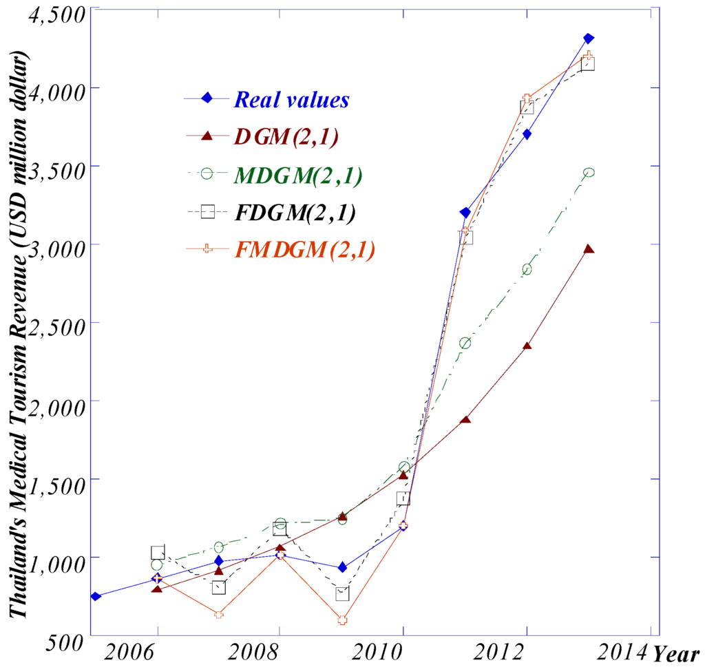 The rapid development of the internet, low-cost outboard travelling, the globalization of health care services and the increase in private health care demand are the result of the booming of medical tourism industry around the world, especially in Asia. Over the last decades, promotional campaigns aimed at developing medical tourism as a major industry has been launched in Southeast Asian countries. With the encouragement of government and the efforts of policy-makers, and based on the competitive advantages of low-cost treatments, advanced technologies in medical specialties, flexible treatment procedures, less-stringent government regulations and effective marketing strategies, some countries such as Thailand, Singapore, Malaysia, India, Korea and Taiwan have successfully gained a remarkable position in global outbound medical services. Among these, Thailand, Singapore and India play a driving role in Asia with approximately 90% of Asia’s medical tourism markets, followed by Malaysia, Korea and Taiwan [25]. Compared with other providers in Asia, Thailand’s medical tourism industry has the highest annual growth rate with more than a million medical tourists per year. Recently, this nation has become a leading destination in the field of cosmetic surgery and sex change operations; therefore, understanding the trends in Thailand’s medical tourism industry is important in evaluating the development of this industry in Asia. For this reason, in this work, forecasting the revenue in Thailand’s medical tourism industry is used as a sample to test the effectiveness of the DGM(2,1) model and its modified models. To conduct this task, the annual data for the revenue in the period from 2005 to 2013 is used to construct the forecasting model. The empirical results are shown in Table 2 and Figure 1.