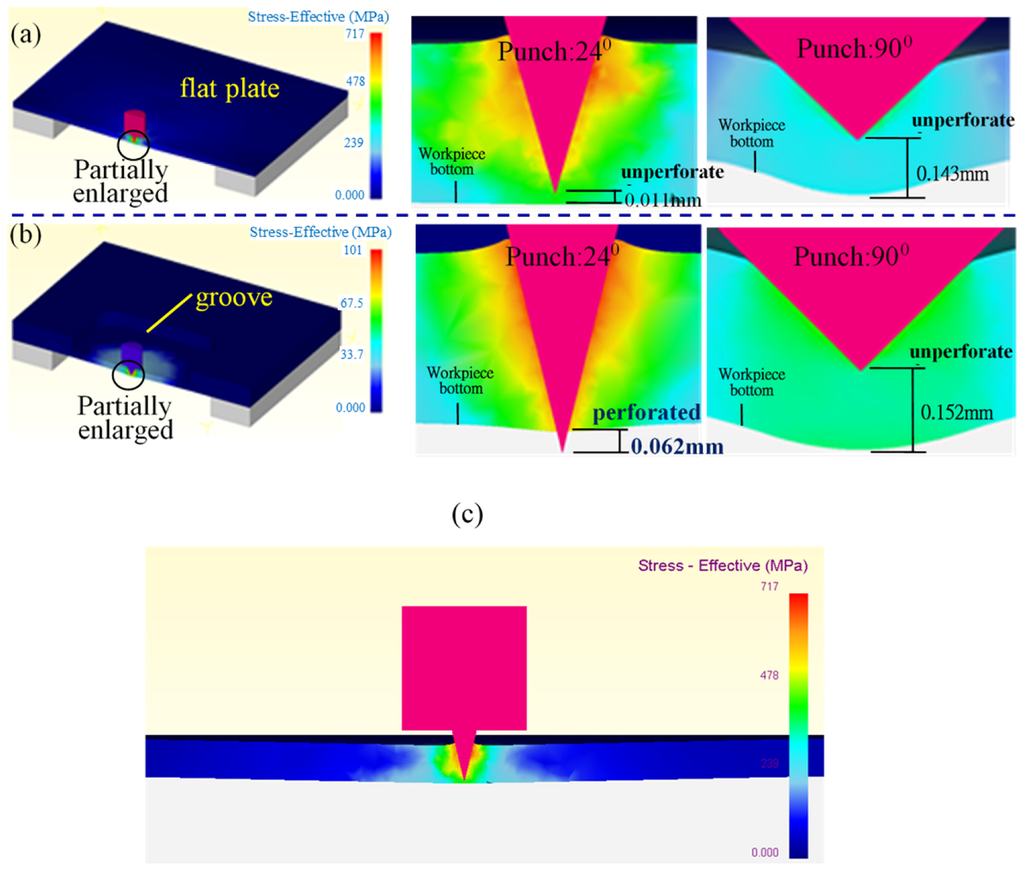 The simulation results of SWD are shown in Figure 4. Figure 4a shows the result of flat-plate workpiece, while Figure 4b shows the result of grooved workpiece. According to the simulation results, when the stamping depth is 0.38 mm at the same punch head angle with flat plates, the workpiece is largely bent, and the workpiece is unperforated. When the workpiece is grooved and the punch angle is 24°, the workpiece is perforated. No buckling is observed, and only deformation around the outlet is shown in the simulation results. However, the workpiece cannot be perforated as the punch angle increases, and it is largely bent.