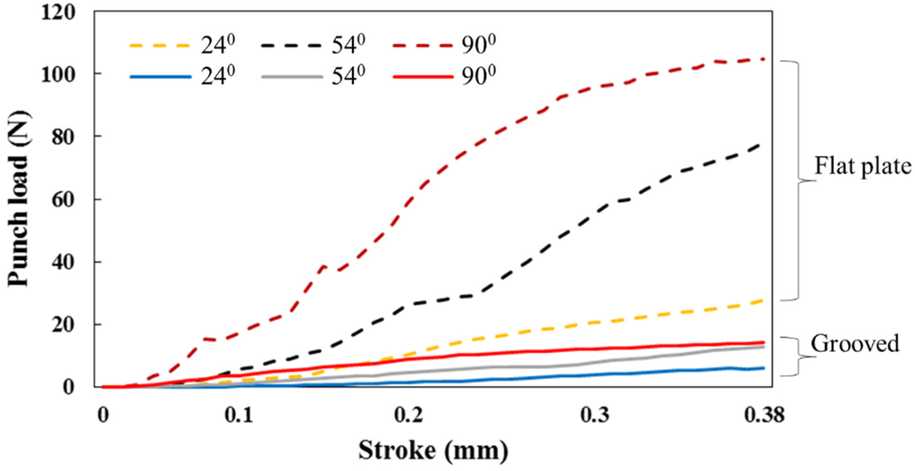 This phenomenon is analyzed in the view of mechanics, where the lower die supporting the workpiece is an 8 mm × 8 mm ㄇ-shaped groove, and the distance between the application point to the bearing point is very large, which results in a very large bending moment. In stress analysis, the area other than the grooving increases the moment of inertia due to a thicker sheet. This groove contributes to enhancing the punching effect. The relationship between stamping depth (stroke) and punch load is as shown in Figure 5. The punch load is relatively high with a flat plate, and because the tapered punch is V shaped, the lateral force on the punch increases as the workpiece bends (as shown in Figure 4c), and the punch load is high.