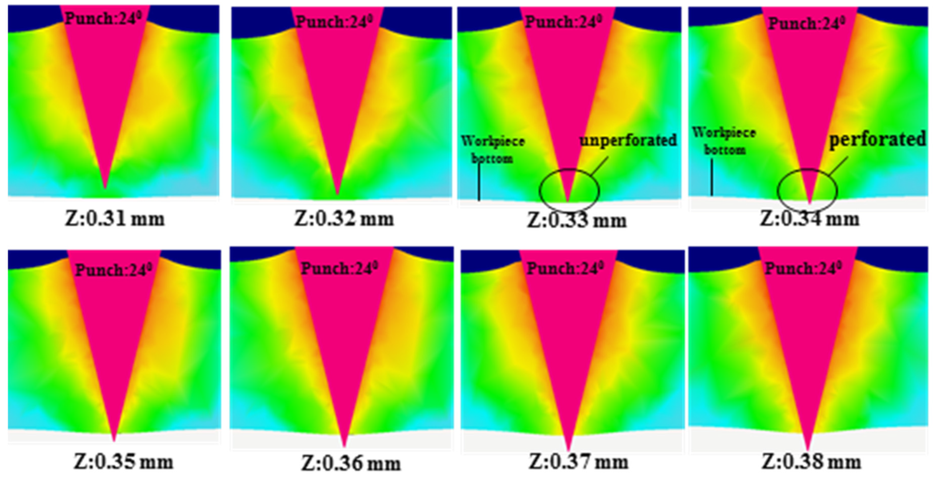When the workpiece is grooved, the punch at 24° has good punching result. The microhole forming process is as shown in Figure 6. When the stamping depth is 0.34 mm, the workpiece begins to be perforated, and the outlet diameter increases with the stamping depth. While the outlet is slightly bent, it is restricted to the nearby area of the outlet. This result can predict the relationship between stamping depth and perforation. The simulation results will be compared with experiments in the next section.