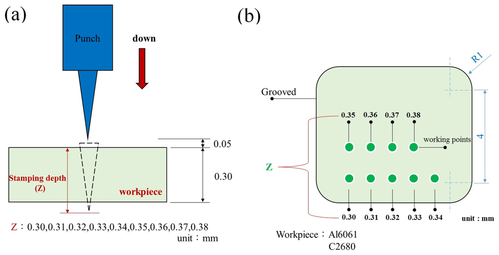 Schematic diagram of processing mode (a) stamping depth definition (b) working point position.