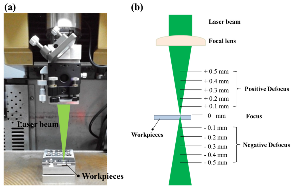 The laser processing experiment is as shown in Figure 8a. The laser source is a Nd:YAG laser (LOTIS TII LS-2134UTF, Tokyo Instruments, Inc., Edogawa-ku, Japan) with second harmonic of a 532 nm wavelength. In order to discuss the effect of the defocusing distance on the hole morphology, the focusing lens focal length of 120 mm is changed; The laser processing has not specified the long and short focal lengths. The defocusing distance ranges from +0.5 mm (positive defocus) to −0.5 mm (negative defocus) with an increment of 0.1 mm, as shown in Figure 8b.