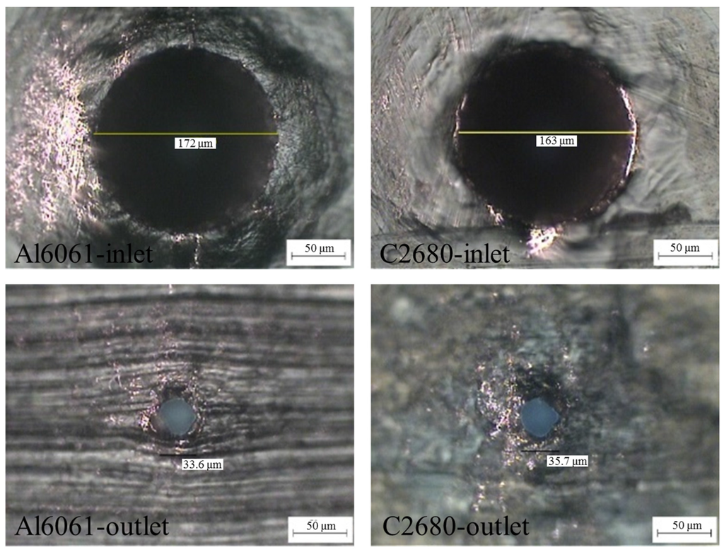 - The stamping results of Al6061 and C2680 workpieces show that, with the same stamping depth, the prominence height at the inlet of the C2680 is lower than Al6061 (~20%). The results show that the C2680 workpiece has better micro tapered hole wall quality than Al6061.