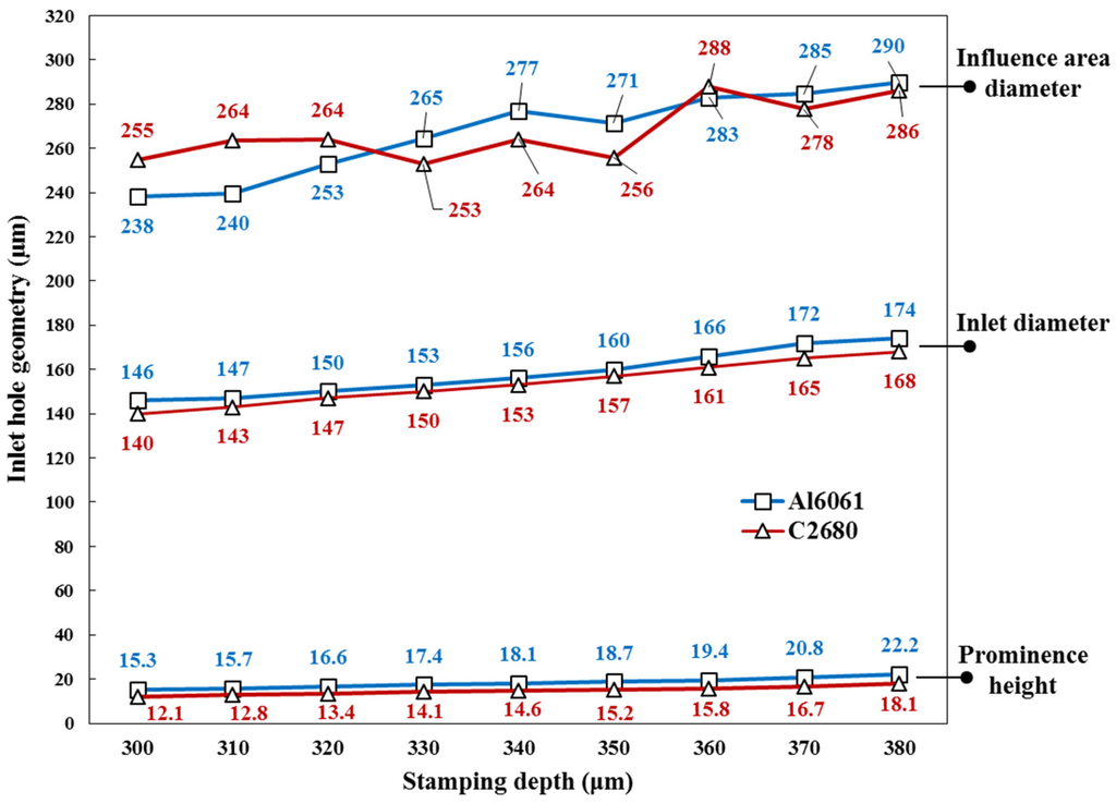 The inlet diameter and influence area diameter are measured by averaging the measured results in both the X-, Y-axial directions. The prominence height is a distance between the workpiece surface and prominence top and measured by averaging the four point measurements at the top of the prominence. Figure 11 shows that the inlet diameter and prominence height increase linearly as the stamping depth increases. Meanwhile, the inlet diameter of Al6061 is larger than C2680, and the diameter difference is about 4 μm with the same stamping depth. The prominence height has a linear trend with the inlet diameter, as they are related to each other.