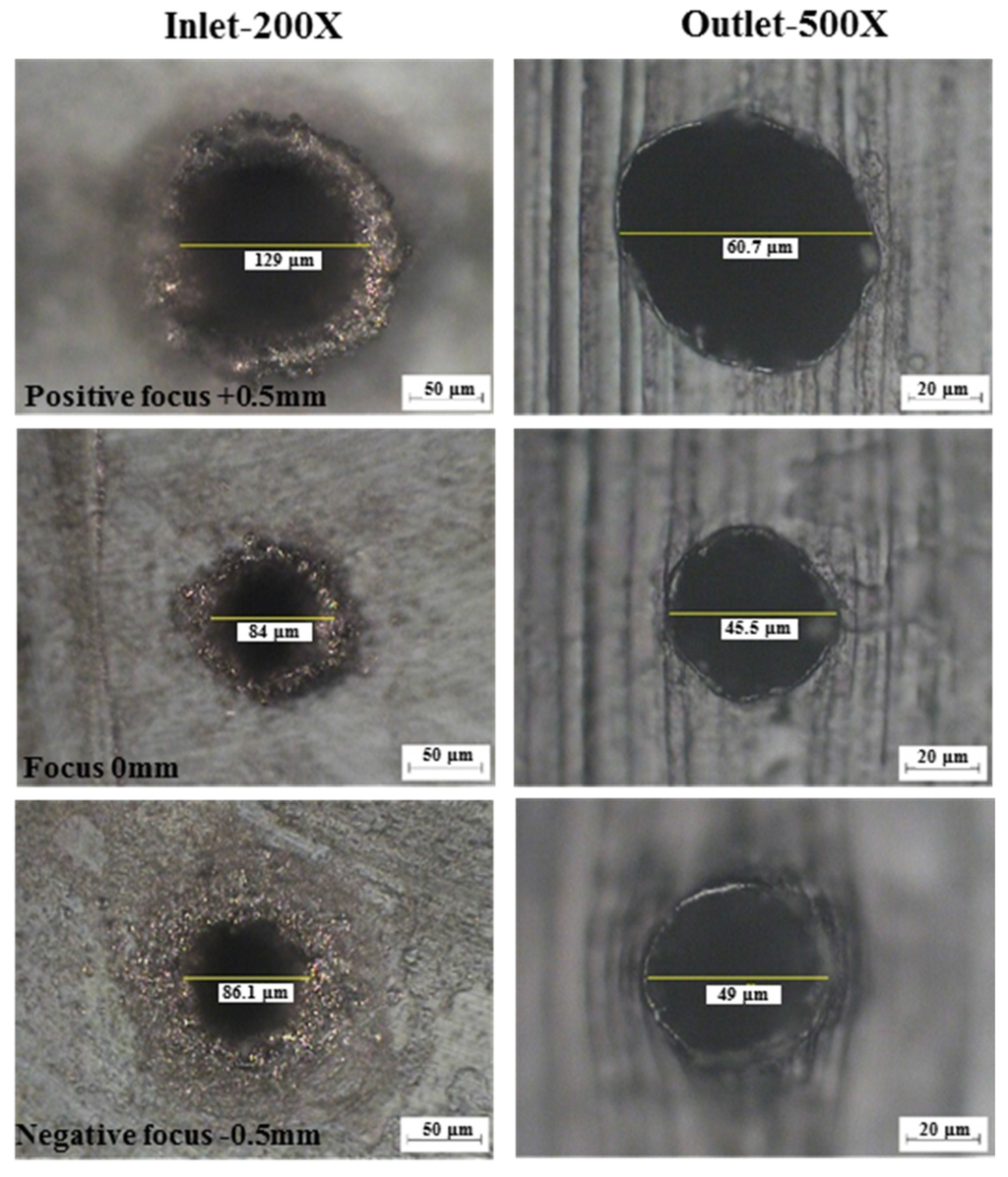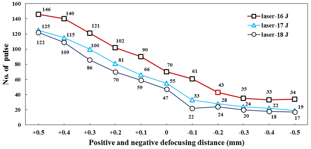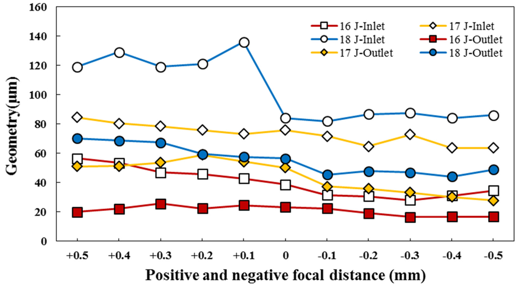The inlet and outlet morphologies of the laser processed holes are as shown in Figure 13. When the defocusing distance of the process is increased, the laser focus spot diameter increases, and the depth of the field increases accordingly. When the defocusing distance is +0.1–+0.5 mm, laser energy generates a keyhole due to high power density. Meanwhile, the melted material stack around the keyhole. The Heat affected zone (HAZ) width increases due to the defocusing. When the defocusing distance is −0.1–−0.5 mm, the power density of laser is not diffracted along its path as positive defocusing, thus the hole diameter is smaller. Meanwhile, the required number of laser pulse for perforation is less with negative defocusing than with positive defocusing as shown in Figure 14 it shows the relationship between defocusing distance and required pulse number for perforation. The processing time for a focal length of −0.5 mm is the shortest, and may be because the energy density of negative defocus is higher than the positive defocus. The relationship between hole depth and defocusing distance has a similar trend, where the hole depth is inversely proportional to the defocusing distance. As shown in Figure 15, while there is an inlet diameter jump with 18 J laser processing and no obvious change in outlet diameter with 16 J laser processing, the inlet and outlet diameters increases with defocusing distance in other cases. Therefore, the taper angle of holes increases with the defocusing distance. The maximum taper angle is about 9.7°. At the same defocusing distance, a negative defocus results in a larger HAZ width than a positive defocus and it is due to higher energy density.