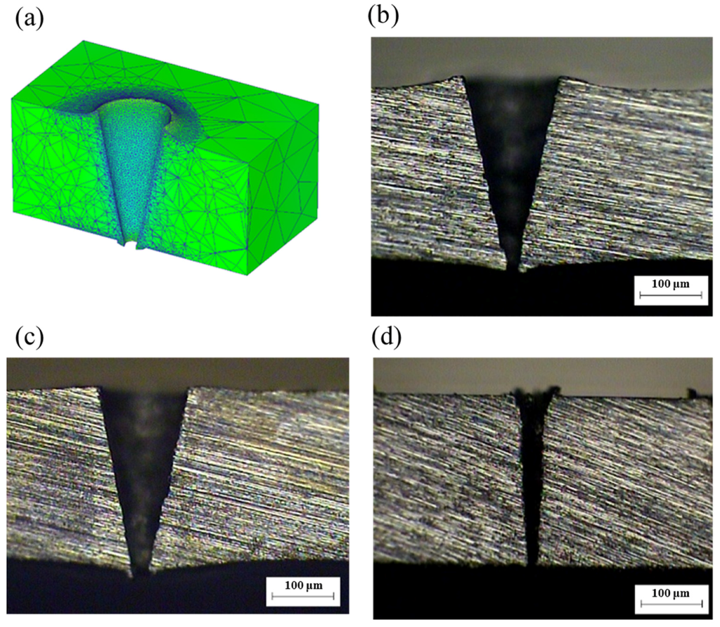 Microhole cross-section (a) simulated view (b) Punch-Al6061 (c) punch-C2680 (d) Laser-Al6061.