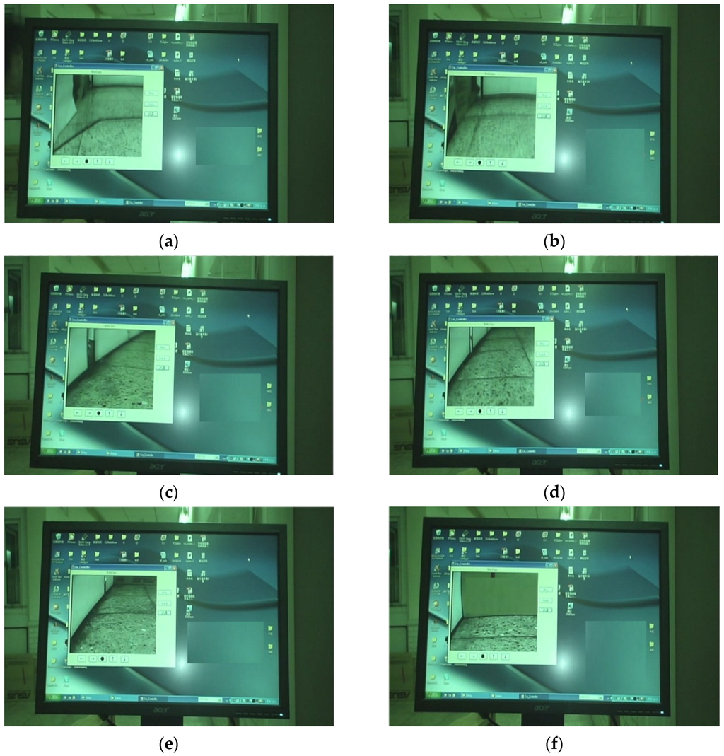 Captured images on PC screen. (a) Captured image on PC screen at Figure 26a position; (b) Captured image on PC screen at Figure 26b position; (c) Captured image on PC screen at Figure 26c position; (d) Captured image on PC screen at Figure 26d position; (e) Captured image on PC screen at Figure 26e position; (f) Captured image on PC screen at Figure 26f position; (g) Captured image on PC screen at Figure 26g position; (h) Captured image on PC screen at Figure 26h position.