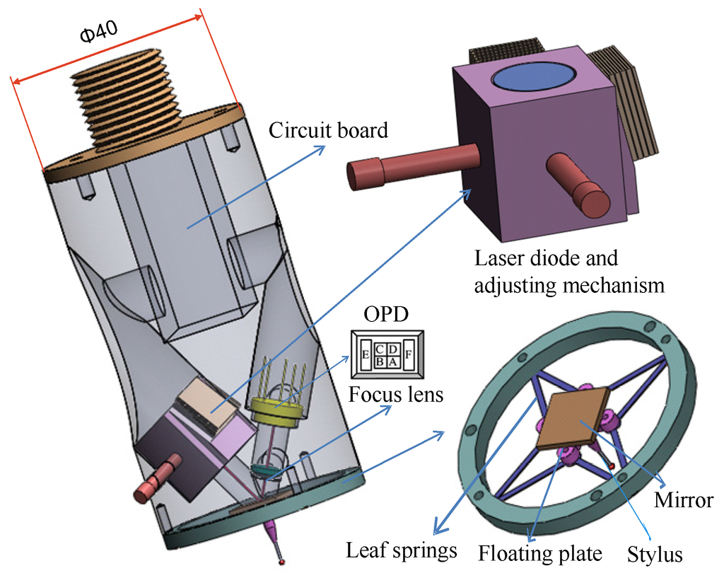 This touch trigger probe, shown in Figure 1, mainly consists of three components: a QPD-based sensor, a floating plate, and a tungsten stylus with a ruby ball tip. A plane mirror is adhered to the upper surface of the floating plate. The stylus is mounted on the center position on the lower surface of the floating plate. Four V-shaped leaf springs, fixed to the probe housing, are designed to connect the floating plate. When a contact force is applied to the ball tip of the stylus, the floating plate and the stylus perform a rigid body motion. Simultaneously, the four leaf springs yield corresponding elastic deformations by the floating plate, and the plane mirror on the floating plate tilts along horizontal axes or displaced in the vertical axis. The probe housing is made of an aluminum cylinder. The QPD, the focus lens, and the circuit board are imbedded in the probe. A laser diode is placed on an adjusting mechanism whose elastic component is formed by folding a beryllium–copper alloy sheet. The adjusting mechanism is applied to assure the reflected laser beam being focused onto the centre of the QPD in the initial state.