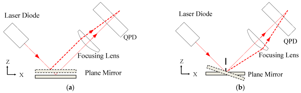 Figure 2 shows the optical path of the sensor system, which is composed of a laser diode, a plane mirror, a focusing lens, and a QPD. The laser beam from the laser diode with an incident angle is reflected by the plane mirror and then projected onto the QPD via the focusing lens. A tilt angle or a vertical displacement of the plane mirror causes a lateral shift of the focused light spot on the QPD. The QPD outputs the light energy of each quadrant photo detector into an electrical current signal. By applying an appropriate resistance to these current signals, four output voltage signals (VA, VB, VC, and VD) can be obtained. Two-dimensional shifts of the focused light spot caused by the motion of the plane mirror can be expressed by Equations (1) and (2), in which k1 and k2 are constants [26]. When the ball tip is contacted in any direction by the workpiece, the probe generates a trigger signal at the same time.