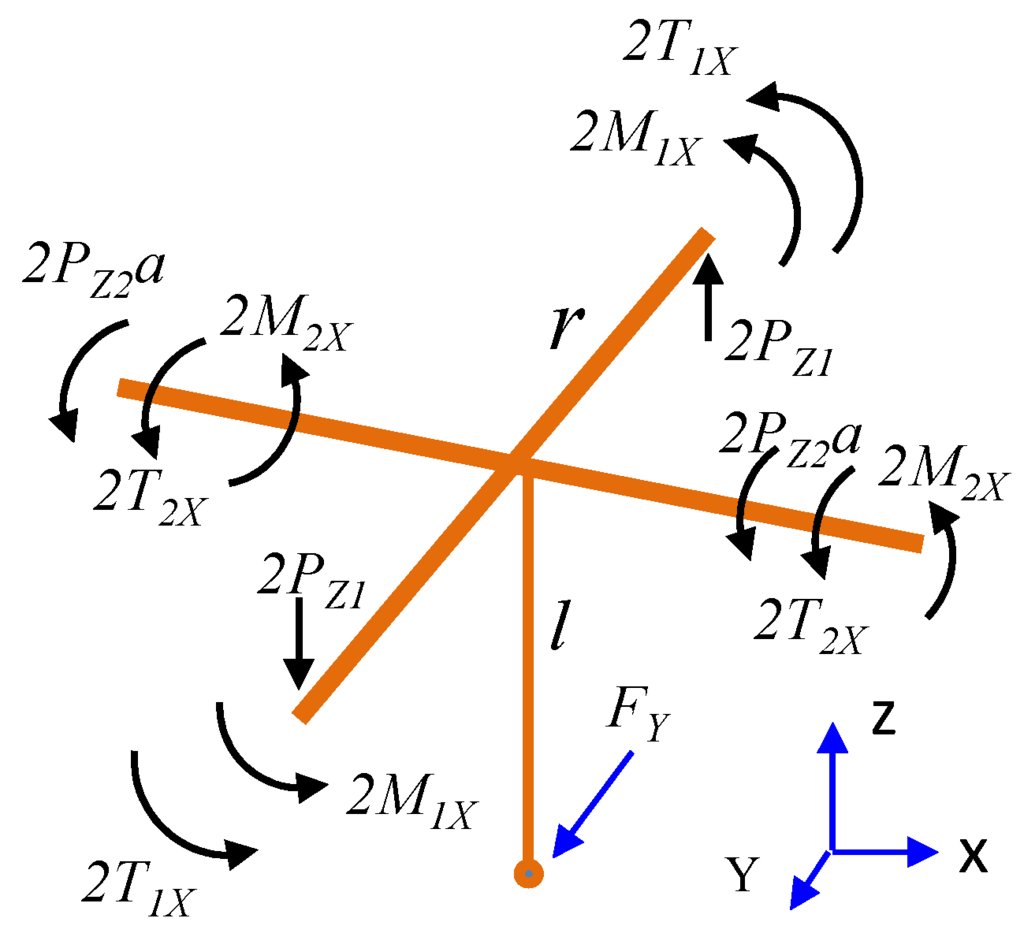 The free-body diagram of the floating plate is illustrated in Figure 5. T, P, M, F are torque, shear force, bending moment, and contact force, respectively. The characteristics of this probe between the contact force and the ball tip’s motion were analyzed, and the stiffness models in horizontal and vertical directions are as follows [26,27].