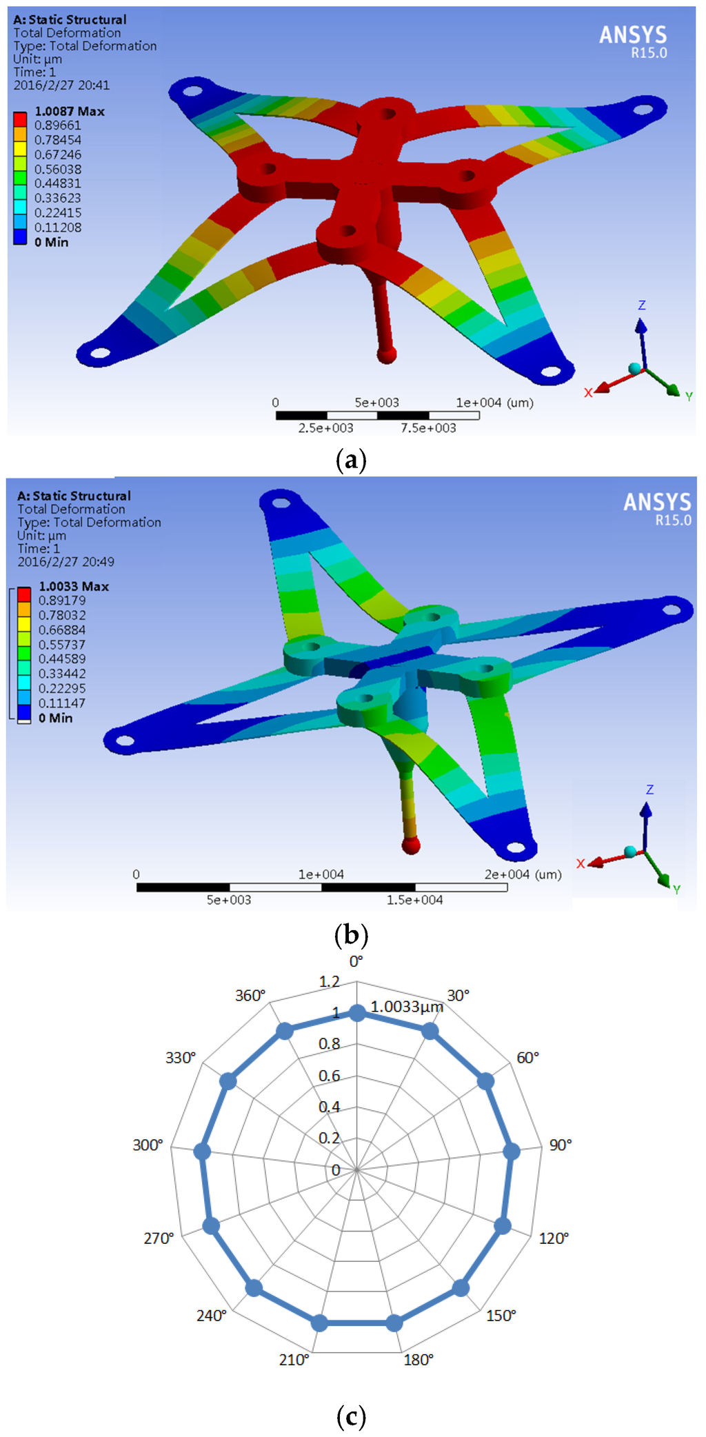 A finite element analysis for the probe was also performed using ANSYS V15 software (Ansys Inc, Canonsburg, PA, USA, 2014) so as to verify the stiffness model. The parameters listed in Table 1 were used. Structural deformations are shown in Figure 6a,b when 1 mN of force is applied in the vertical and horizontal directions, respectively. The resulting tip displacement of nearly 1 μm is almost the same in both directions, corresponding to a uniform stiffness of 0.926 μm. Figure 6c illustrates the uniformity of the probe’s stiffness along the X-Y plane. In addition, the experimental verification for the stiffness of the floating mechanism was also conducted using a high sensitivity force sensor [26]. The stiffness measurements were 0.954 N/mm in the Z-direction and 0.927 N/mm in the horizontal direction, which is quite consistent with the finite element analysis and analytical results [27].