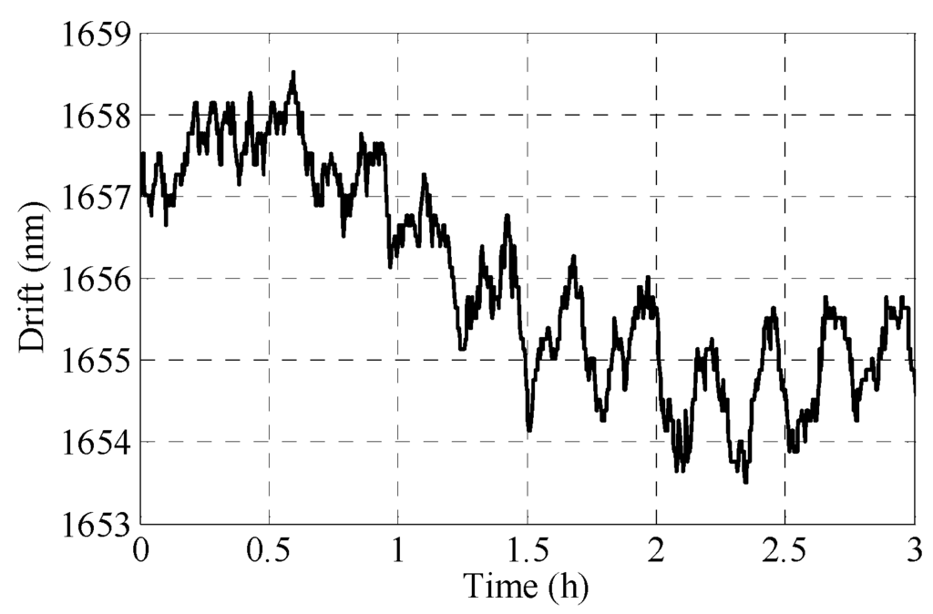 In order to reduce the influence of the environmental temperature fluctuation, a low-cost vibration-free constant-temperature mini chamber was developed by our group [28,29]. The experimental setup, as shown in Figure 7, was put in the chamber, and the probe was adjusted to output a non-zero value. The stability of the probe was not investigated until the temperature in the chamber had been stabilized to within 20 ± 0.05 °C, as shown in Figure 8. Figure 9 shows the stability test results of the probe. It can be seen that the total drift of the probe was less than 5 nm for duration of three hours, and the fluctuation was less than 3 nm after two hours. The stability of the probe is thus confirmed.
