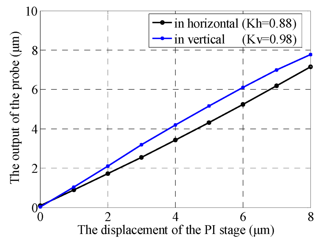 Figure 10 shows the sensitivity and permissible range of the probe. It can be found that the sensitivities of the probe in horizontal and vertical directions were nearly equal and coincident with the design target quite well when the ball tip’s displacement was within 1 µm. In other words, the probe has a uniform sensitivity within a trigger range of 1 µm that is large enough for the touch-trigger measurement. Figure 10 also illustrates that the probe has a permissible range up to 8 µm, which provides a large safety margin for the application of the probe. The difference between two sensitivity curves could be caused by the error of manufacturing and assembly.