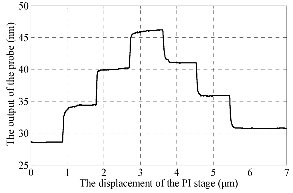 An experiment in the same condition as the repeatability test was carried out to investigate the resolution of the probe and the result is shown in Figure 11. The probe ball tip was pushed three steps by the gauge block with a step of 5 nm actuated by the PI stage and then returned back to the initial position. The steps of the probe precisely follow the motion command. Therefore, we can say that the probe has a resolution of less than 5 nm. The different outputs of the probe tip between the beginning and the end might have been caused by the short periodic fluctuation shown in Figure 9.