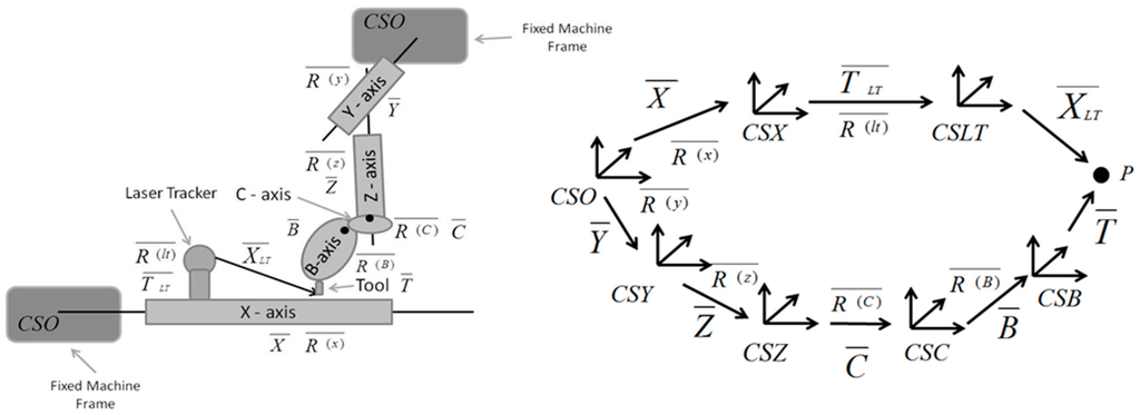 To obtain the combined effect of all geometric errors of the MT through its kinematic model, the measurement system (LT) must replace the part and the retroreflector must replace the tool (Figure 1). The kinematic model of the MT to be verified is represented by XFYZCB, where F determines the fixed part of the machine, the X-axis drives the worktable, Y and Z are combined to actuate the tool, and the C/B rotational axis allows head orientation, providing five degrees of freedom to the MT (Figure 1, Table 1).