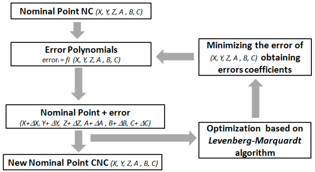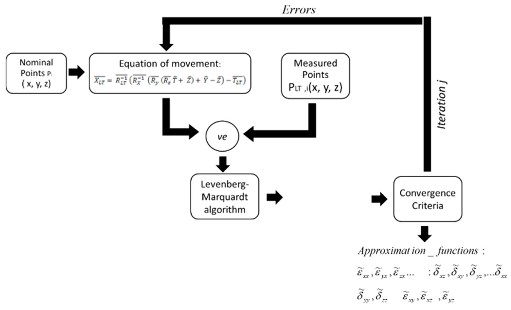 The relationship that provides this equation generates a non-linear equation system. Using the Levenberg–Marquardt algorithm in a non-lineal optimization process, the approximation functions of geometric errors are obtained reducing the volumetric error.