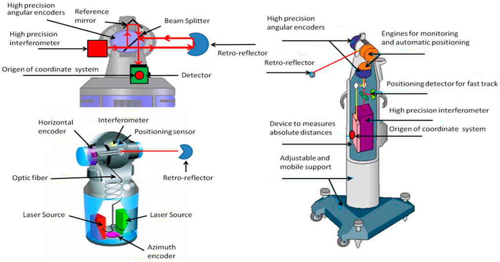 The three biggest LTs manufacturers are Leica Geosystems, Faro Inc. (formerly SMX, Lake Mary, FL, USA), and API (Automated Precision Inc., Rockville, MD, USA). All of them have their own design and system characteristics. Also, the origins of their own coordinate systems are in different places (Figure 3).