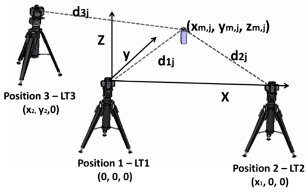 The equations system defined by LT coordinates can be solved analytically. However, the most useful technique, thanks to its accuracy, is trilateration using optimization [,]. This technique is based on an iterative process of parameter identification. The producer minimizes the difference between distances measured for each LT (Equation (10)).