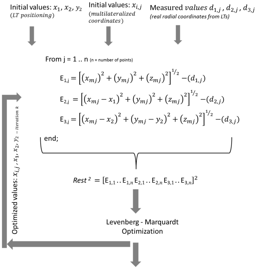 Therefore, parameters to be identified are the LT positions X1, X2, and Y2, and the multilateralized coordinates xm,j, ym,j, and zm,j with j = 1 n (n = number of points). These parameters are obtained by non-lineal optimization techniques based on the Levenber-Marquadt algorithm as shown in Figure 5.