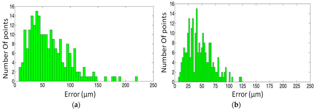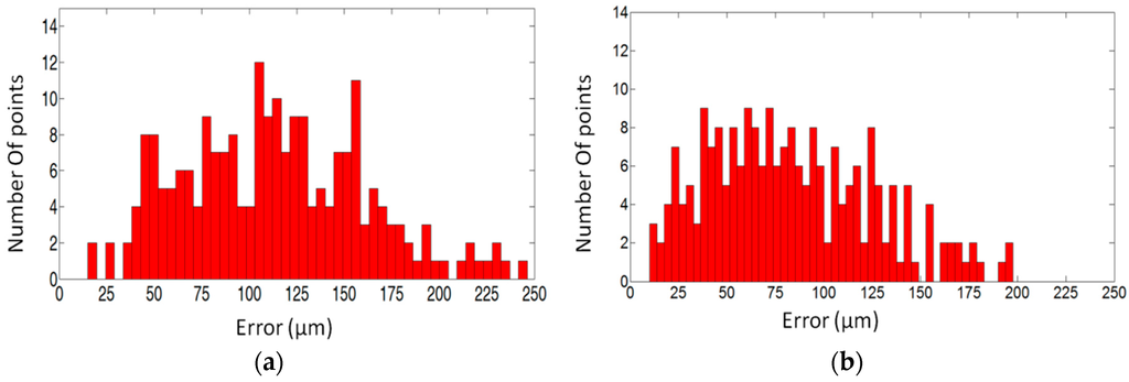On analyzing the initial errors after thermal variations, the results displayed in Figure 9, which represent an error histogram of verification points, show that its current compensation reduces the maximum error from 246.3 to 197.7 µm, the average volumetric error from 112.9 to 83.1 µm, and the minimum error from 15.1 to 10.1 µm. Therefore, it reduces the average positioning error of the MT by 26.5%.