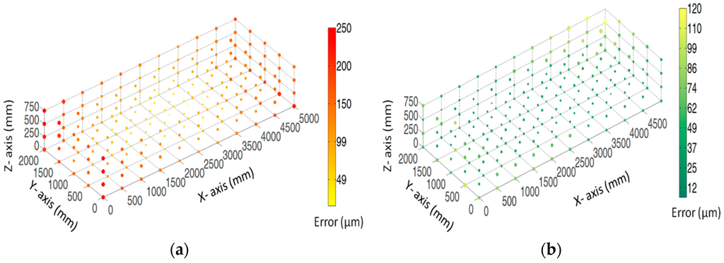 The histograms in Figure 10 show that the global error of the machine has been reduced. However, to find out how errors are distributed in the MT workspace, color maps such as that in Figure 11 are studied. It shows that volumetric verification provides a homogeneous correction on the whole of the MT workspace, avoiding areas of failure at the ends of the axes of movement. Among the non-geometric errors of the MT such as repeatability, deformations, and so on, one of the most relevant is the backlash error of the axis of movement. It is not introduced in the kinematic model of the machine. However, to reduce its influence, verification points are measured twice; in the first measurement, the effect of backlash has a certain direction while, in the second one, it has the opposite direction. In this case, the coordinates of the measured point are the average of the coordinates obtained in the backward and forward measurements. In the same way, temperature variations should be controlled during verification, preventing the occurrence of thermal gradients due to light sources, air currents, and so on. This source of error changes the machine structure and affects the measured points. Therefore, it is necessary to monitor the temperature variations during and between tests.