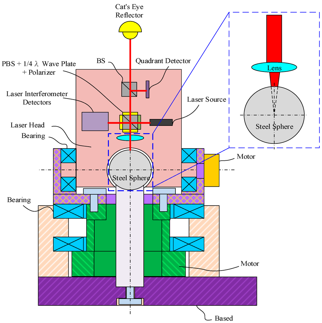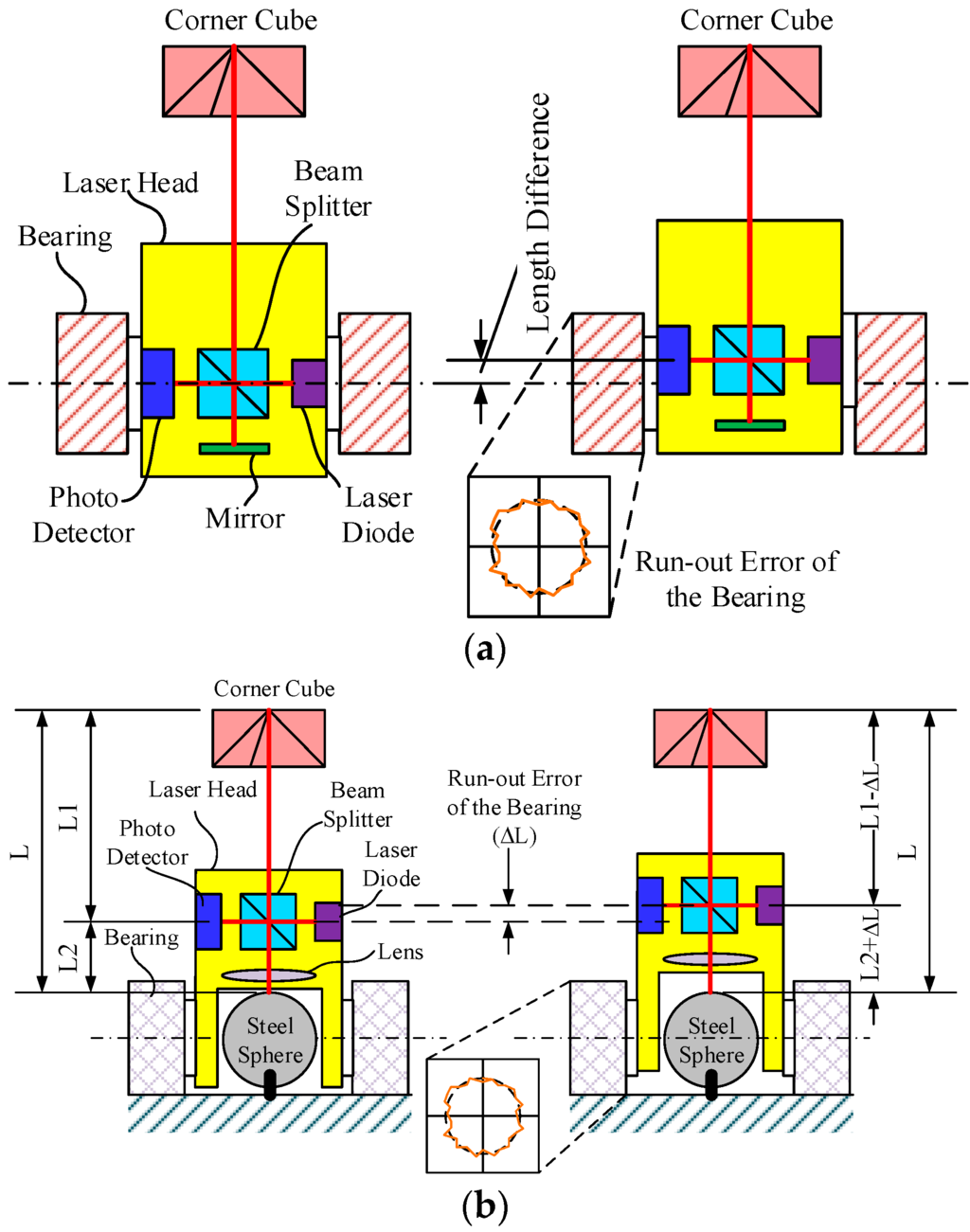 - To reduce the measurement error due to bearing run-out error and mirror offset, LaserTRACER uses a steel sphere instead [18]. As seen in Figure 2a, when the laser head is rotated, the bearing run-out error affects the length difference. When a lens and a steel sphere are used instead, the run-out error can be eliminated, as shown in Figure 2b.