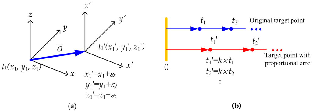 Illustration of the simulation for machine tool moved with positioning error: (a) coordinate offset; and (b) proportional error. (Note: vector represents the coordinate offset vector; represents the i-th target point; k represents the proportional value; and represents the i-th target point with coordinate offset or proportional error).