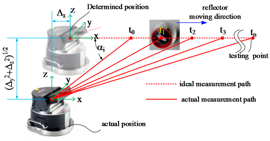 If the actual and determined positions of the ATLI are different, the measurement difference becomes smaller over the measurement distance. In the figure, t0 to tn represent the number of target point to be tested.