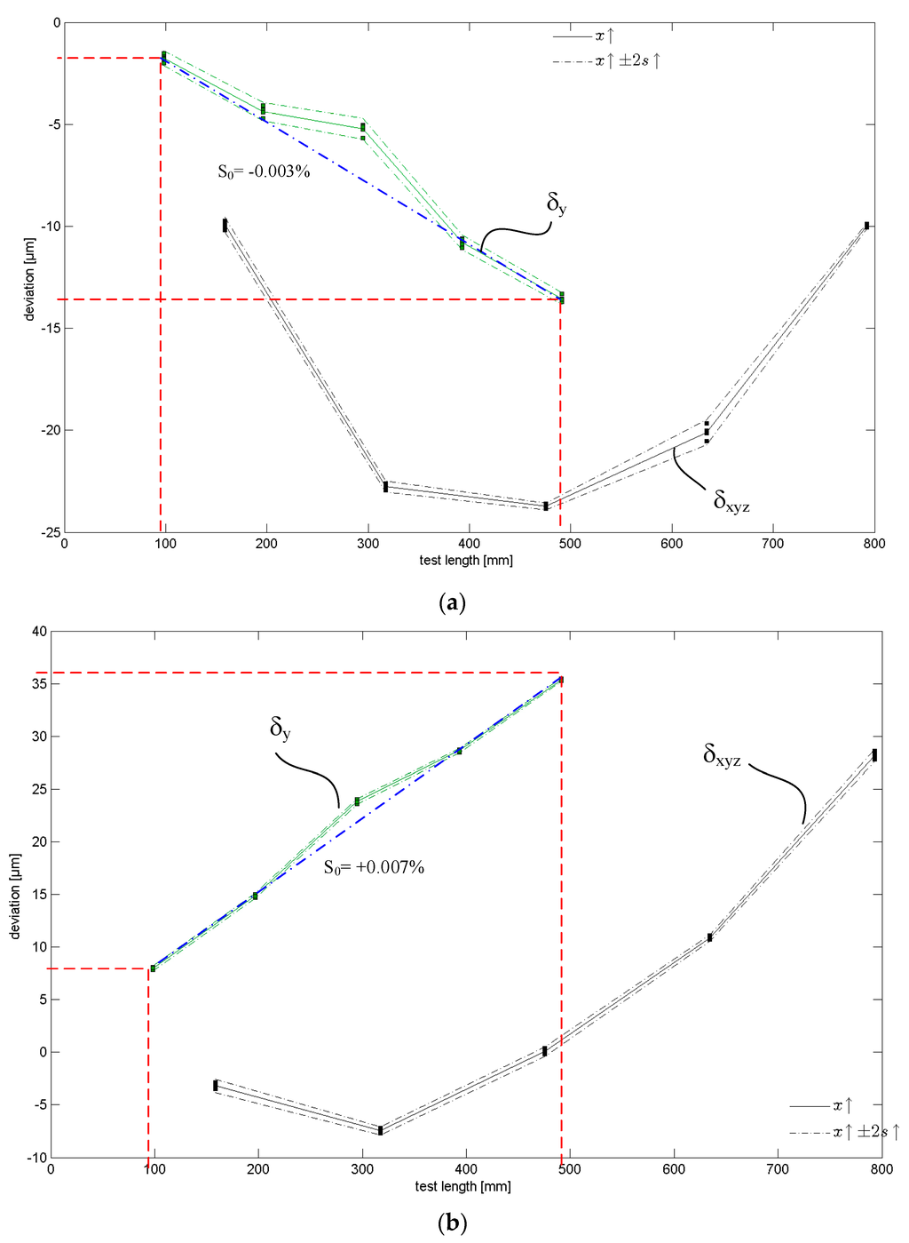 To check whether the proportional error can be found from the ISO 230-2 and -6 tests, we performed ISO 230-2 and -6 tests for y-axis and xyz diagonal line. The testing results before we gave a proportional error are shown in Figure 6a. In Figure 6, the vertical axis represents the deviation value in unit of mm and the horizontal axis represents measurement length in unit of mm. Slop of δy is about −0.003% after curve fitting. After we gave a proportional error of 100.01% for y-axis, slop of δy is increasing to +0.007%, as shown in Figure 6b. To compare Figure 6a,b we can see that the amount of the slop deviation exactly equals to the proportional error that is we giving, and the shape of δxyz is also changed. The testing results also show the proportional error could be compensated by multiplying a constant.