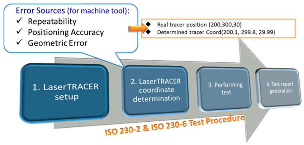 LaserTRACER can work on two modes calibration and ISO test. Calibration mode uses more than four LaserTRACERs or one LaserTRACER with time sharing (i.e., multilateration method) and error mapping to compute the 21 terms of error motion compensation for three-axis machine tools [20,23]. Moreover, LaserTRACER can be applied to calibrate the rotary axes of machine tools [24] and can be applied to extra-small machine tool volumetric error compensation [25]. When LaserTRACER operated in ISO test mode, positioning accuracy of the machine tool causes measurement uncertainty because of misalignment. Since the behavior of misalignment of LaserTRACER is different than laser interferometers, for instance the angle between measurement axis and laser light is a function of measurement length for LaserTRACER, this study was performing three experiments to evaluating the influence of the test results due to misalignment which is caused by positioning accuracy of the machine tools.