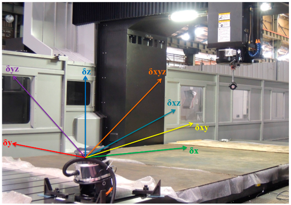 There are 21 terms of error motion effecting spatial positioning accuracy of machine tools [1]. To improve the positioning accuracy and repeatability of machine tools, calibration and geometric error compensation are necessary. However, it is time consuming, and not all controllers suppose geometric error compensation, such as squareness, straightness, angular error motion and so on. The most basic CNC (computer (or computerized) numerical control) controller only provides linear positioning error compensation for machine tool performance improvement, but the improvement is limited. The procedure and method for linear axis positioning accuracy and repeatability measurement can be referred to ISO 230-2 and ISO 230-6 [2,3]. According to the ISO 230-2 and -6 standards, the linear positioning accuracy and the repeatability of x-, y- and z-axes as well as xy, xz, yz and xyz diagonal lines can be found. Note that we called the above-mentioned test the “seven lines test” in this study.