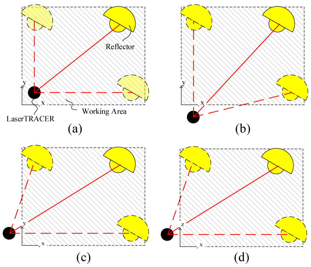 For machine tools calibration by means of LaserTRACER and multilateration (or time sharing), LaserTRACER can be placed out of the range of working area of the machine tool. To perform the seven lines testing, if the LaserTRACER is placed on the wrong position, some lines might be not measured. For instance, Figure 9 shows some situations in the x-y and x-z planes: (a) when the LaserTRACER placed inside of the working area, δx and δy can be performed; (b) when the LaserTRACER placed outside of the working area along y-axis, δx test cannot be carried out; (c) when the LaserTRACER placed outside of the working area along x-axis, δy test cannot be carried out; and (d) when the LaserTRACER placed outside of the working area along x-axis, δz test cannot be carried out. That is, the seven lines could be tested according to ISO 230-2 and -6 if and only if the LaserTRACER is placed inside of the working area of the machine tool in 3D space. Otherwise, some straight lines testing would be not performed.