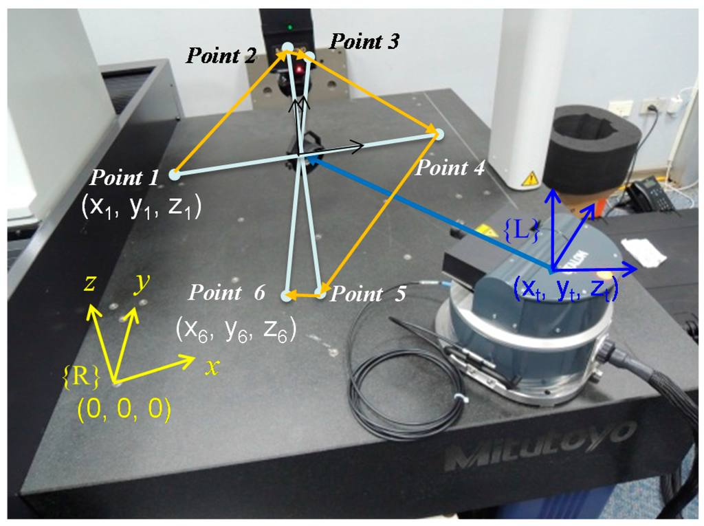 The coordinate of the LaserTRACER located on the machine is determined by six-point measurement, in which {R} represents the reference coordinate system (i.e., the reference point); {L} represents the coordinate system of the LaserTRACER; and {T} represents the coordinate system of the cat’s eye reflector.